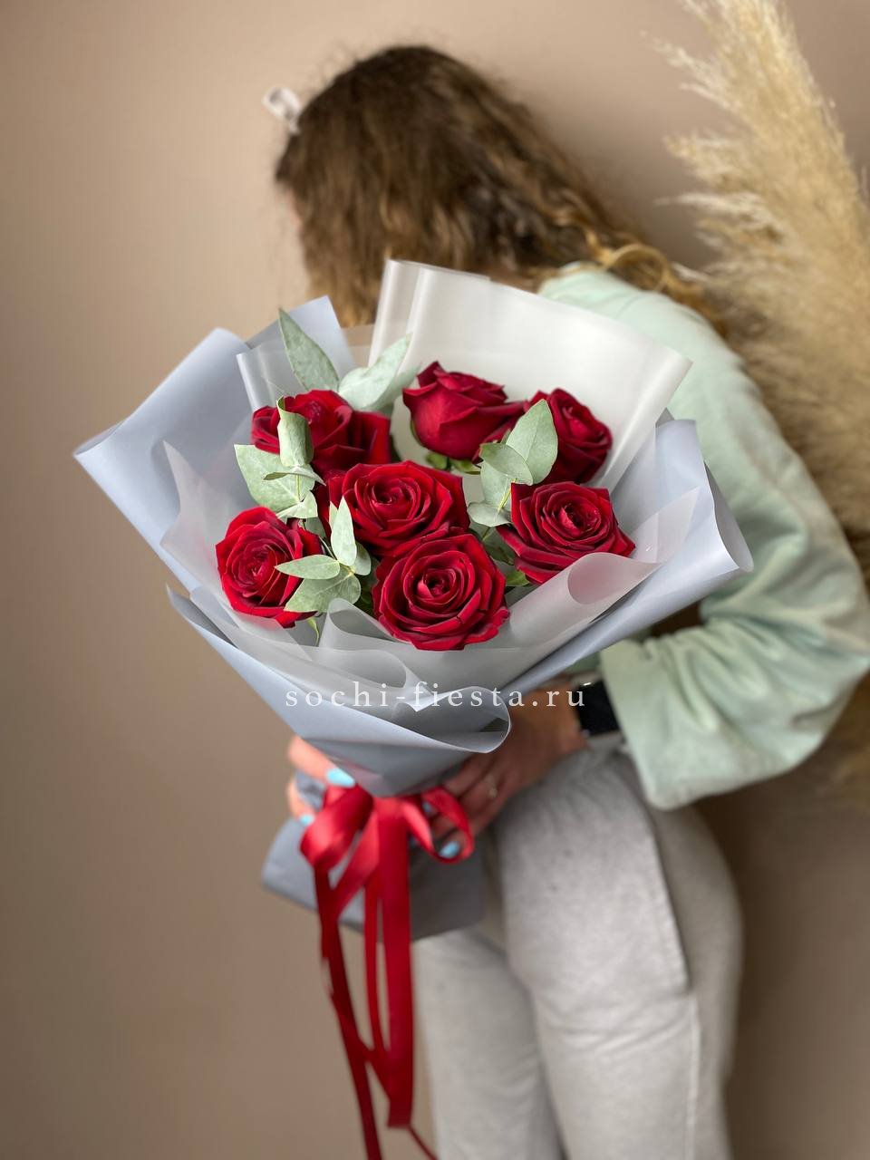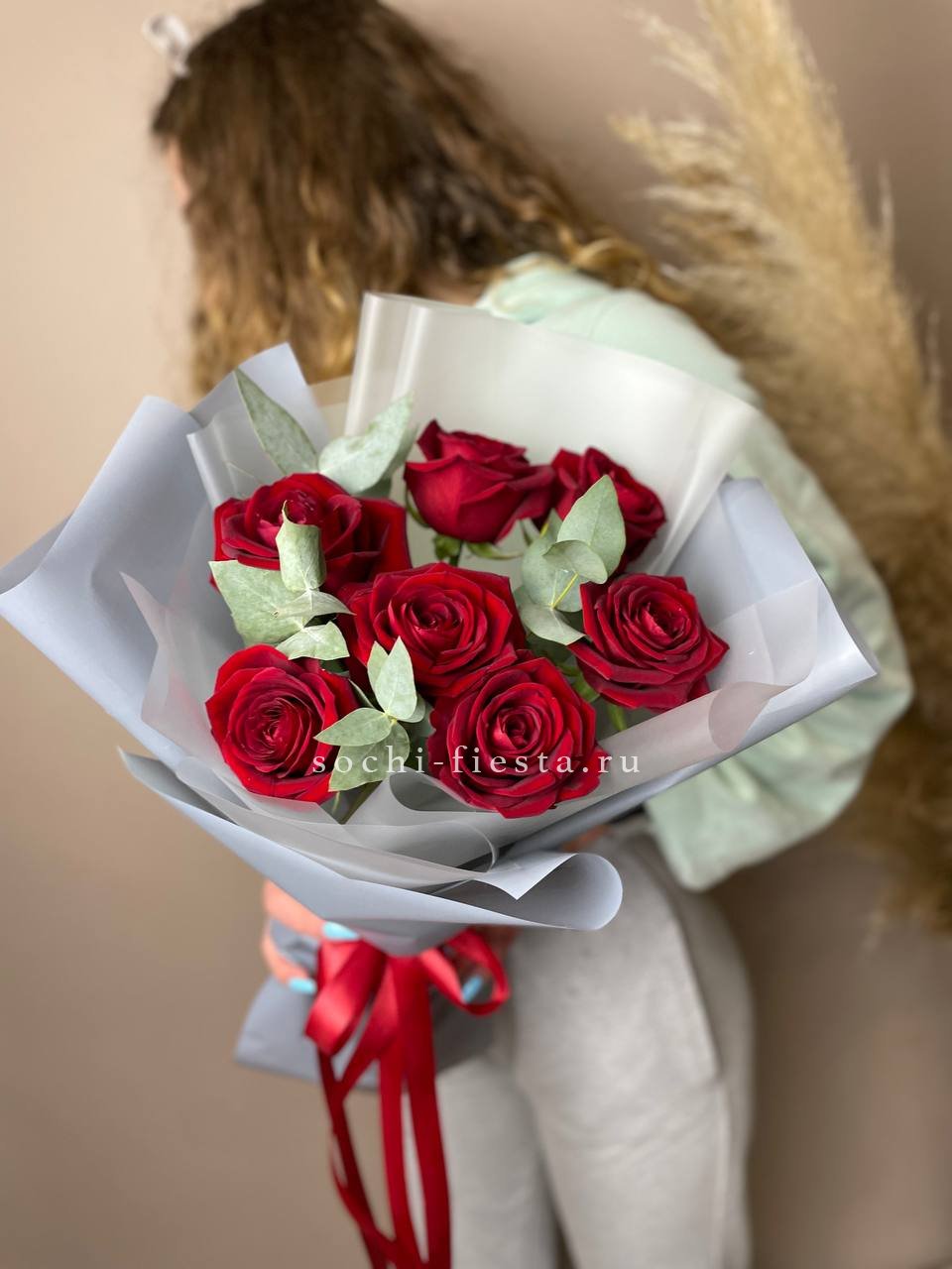 Красные головки роз собраны в плотную композицию с насыщенным цветовым пятном. Лаконичная лента фиксирует букет и добавляет завершённость всей форме.