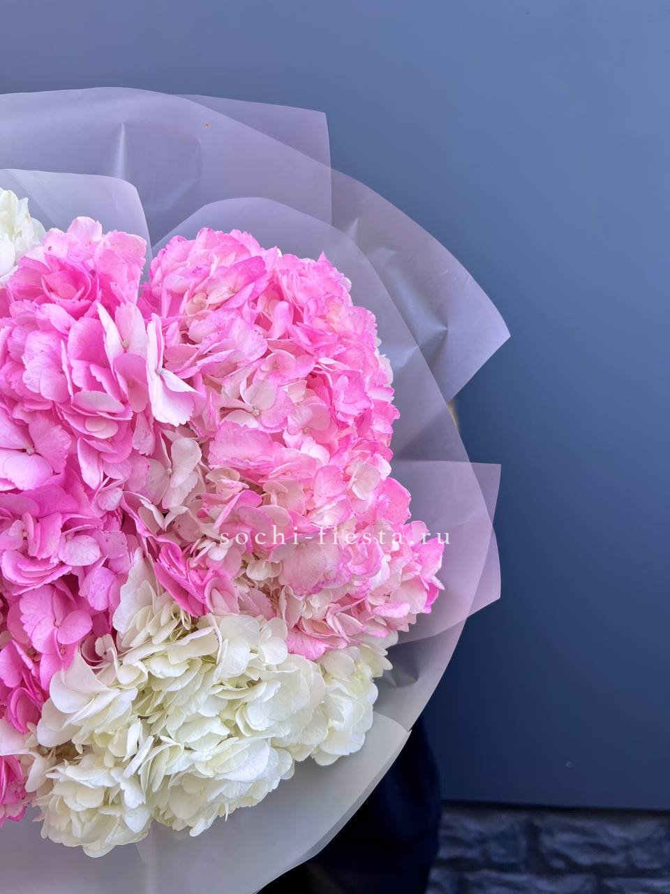Пять крупных соцветий гортензии в бело-розовой гамме образуют воздушную композицию с переливами света на лепестках. Букет выглядит объёмно и свежо, наполняя пространство мягким цветом.