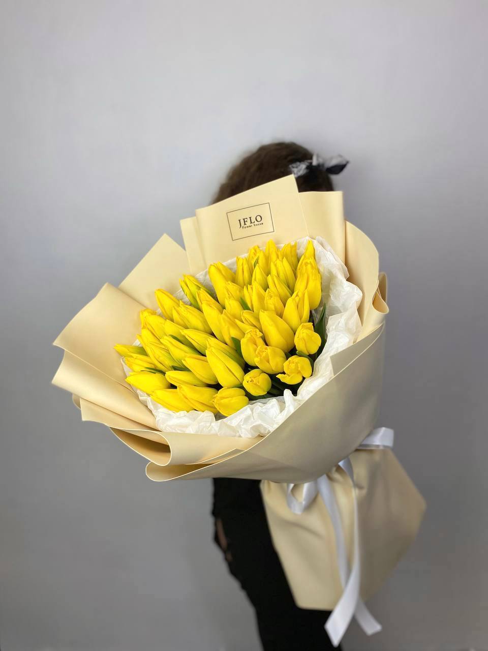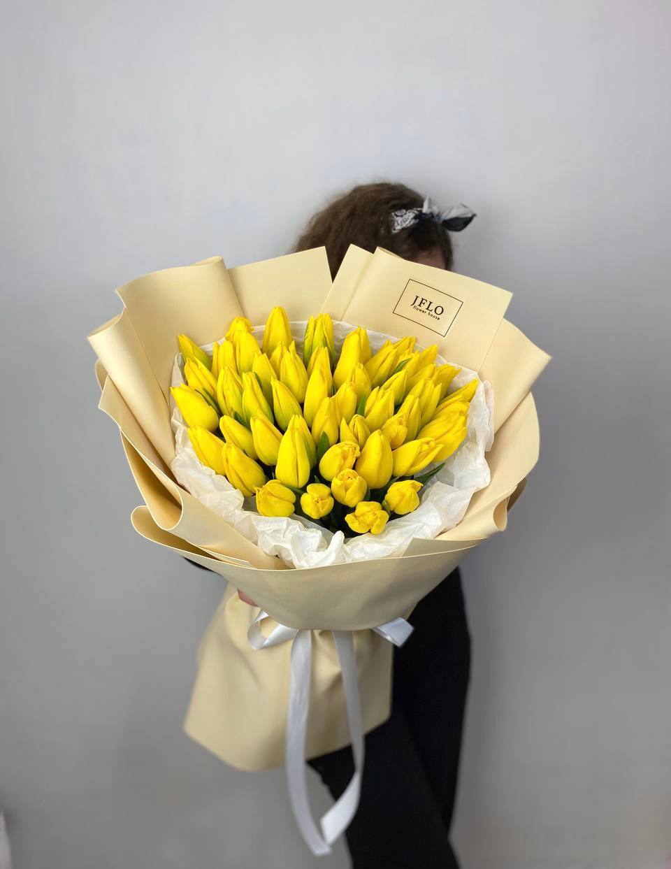 Солнечная волна из пятидесяти одного жёлтого тюльпана заполняет пространство светом и теплом. Плотная сборка бутонов образует яркое цветовое пятно, которое мгновенно приковывает внимание.