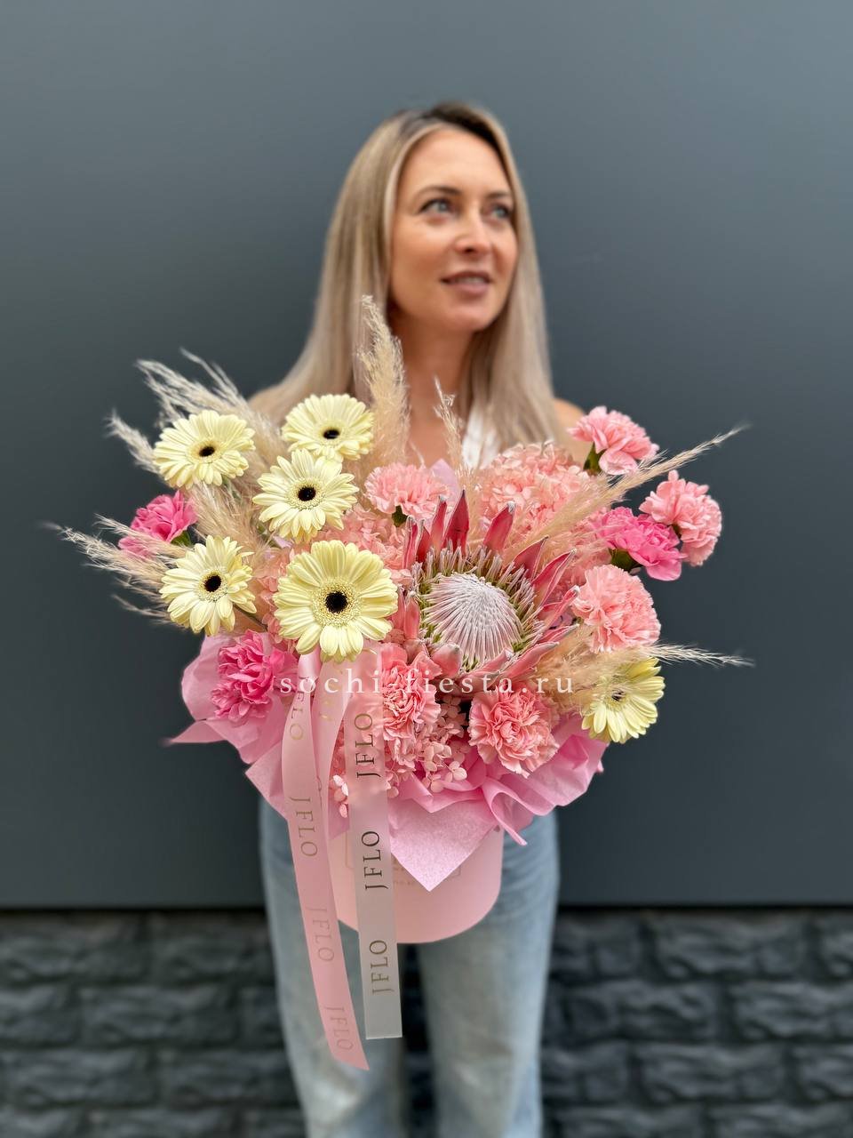 Гортензия и пионовидные розы создают густую округлую форму с мягкими переходами оттенков. Диантус добавляет воздушные вкрапления между крупными бутонами. Композиция в сумке-кашпо держит силуэт и выглядит цельно.