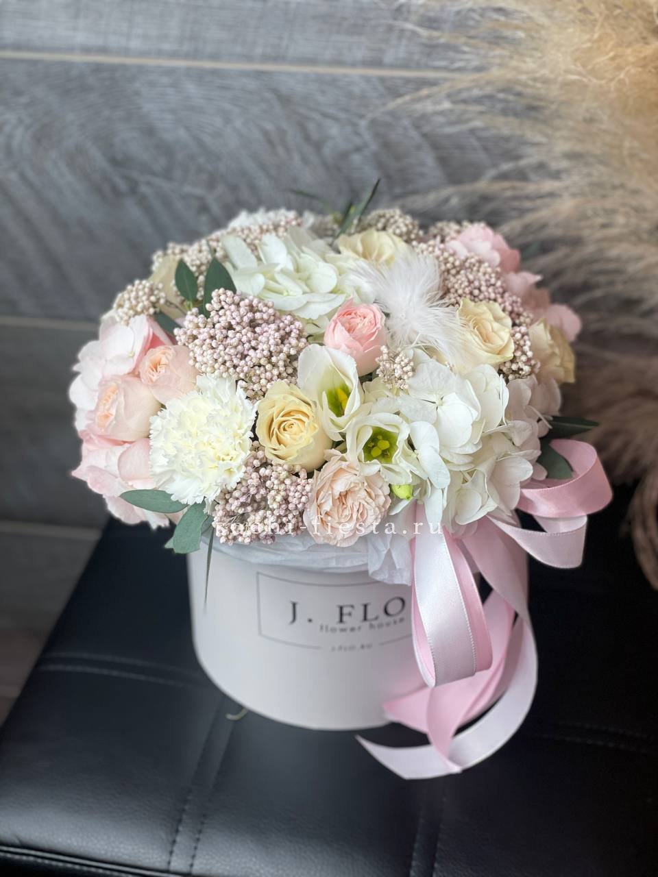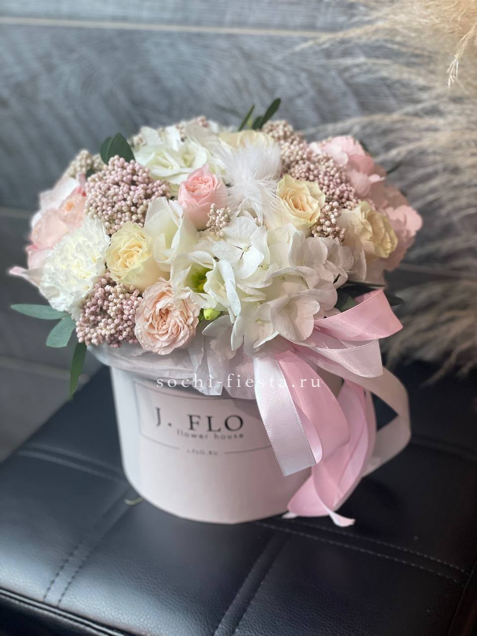 гортензия, вывернутые розы, диантус, кустовая роза, диантусы, оформление в боксе.