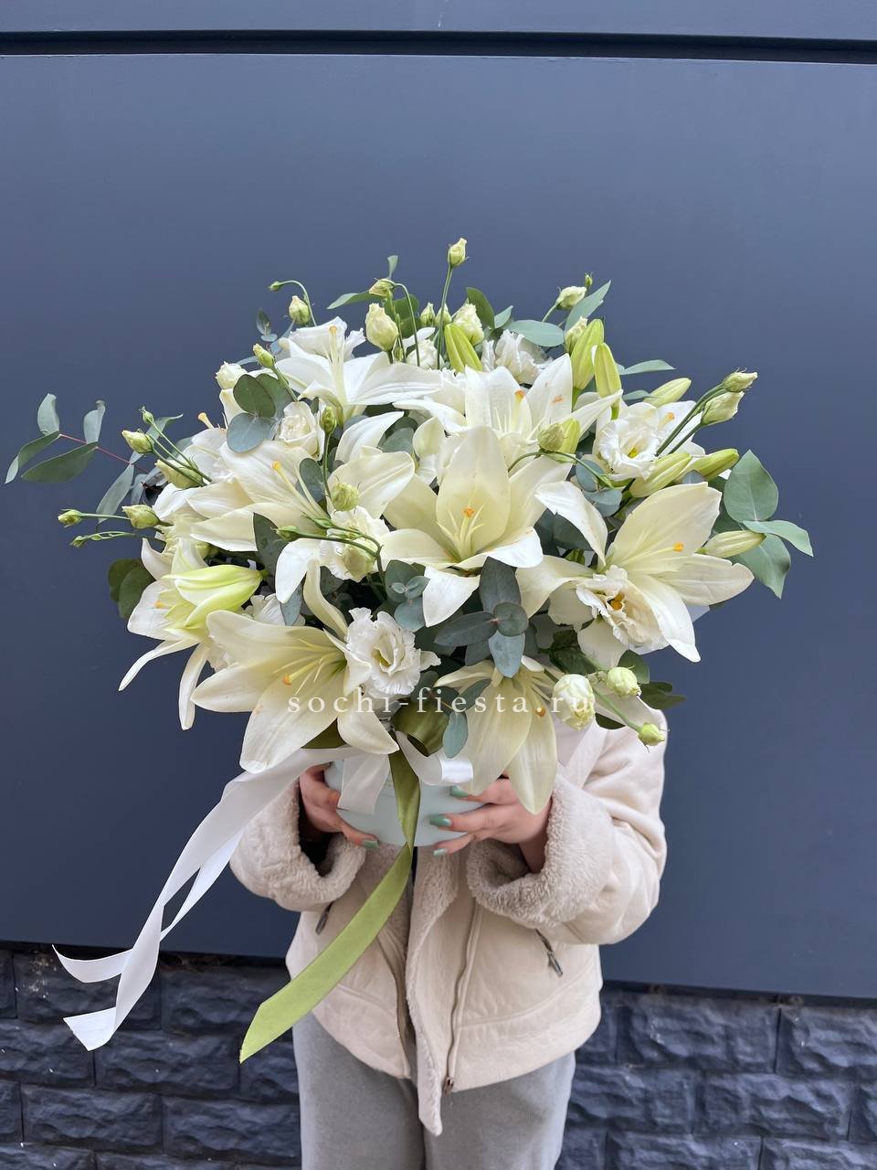 Крупные соцветия лилий соседствуют с воздушной эустомой, образуя выразительную композицию. Эвкалипт обрамляет бокс свежей зеленью, завершая гармоничную картину.