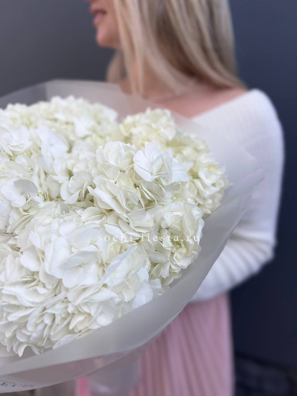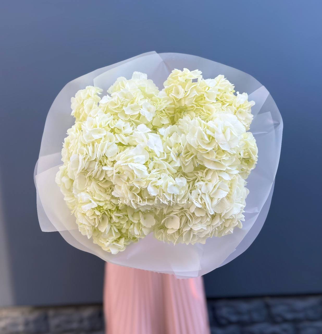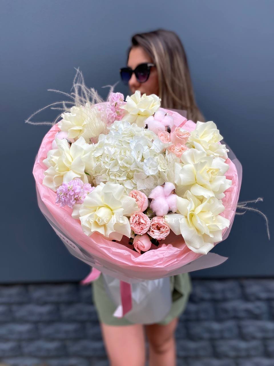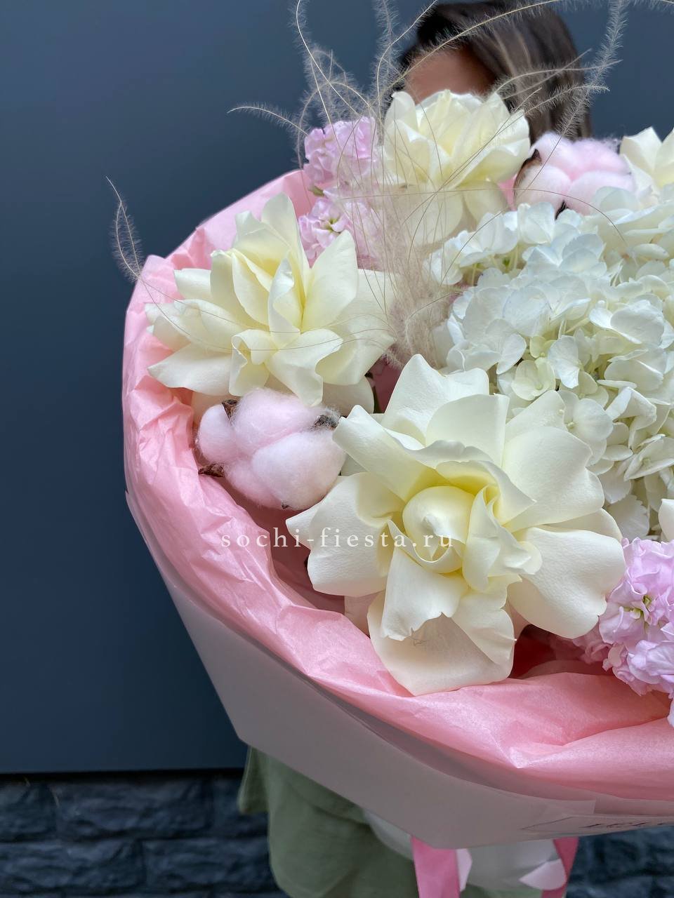 гортензия, хлопок, бомбастик, белая роза, маттиола- может меняться от сезона на диантус, ковыль, упаковка.