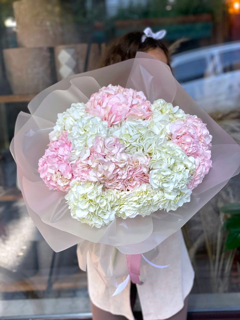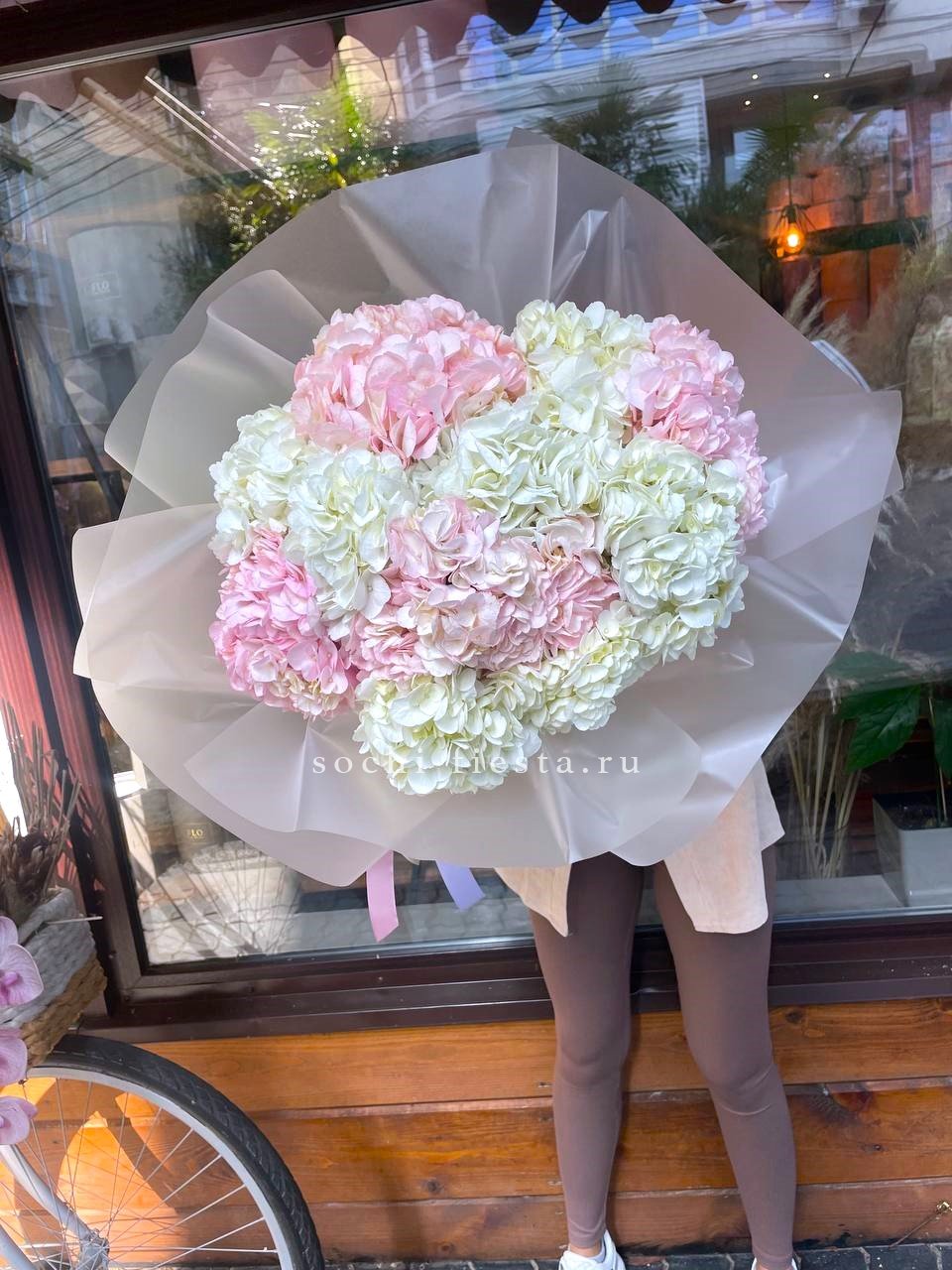 гортензия, хризантема, белая роза, гербера, статица, хлопок, упаковка.