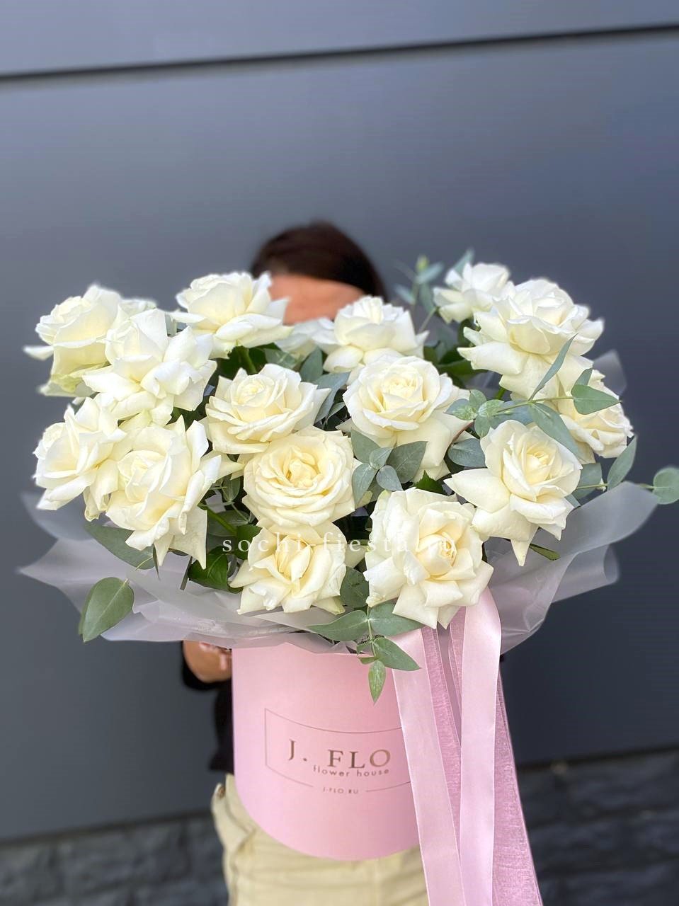 Белоснежные розы и герберы соседствуют с пушистыми шапками хризантем и воздушной статицей. Хлопок добавляет фактурный акцент, делая композицию объёмной и запоминающейся.
