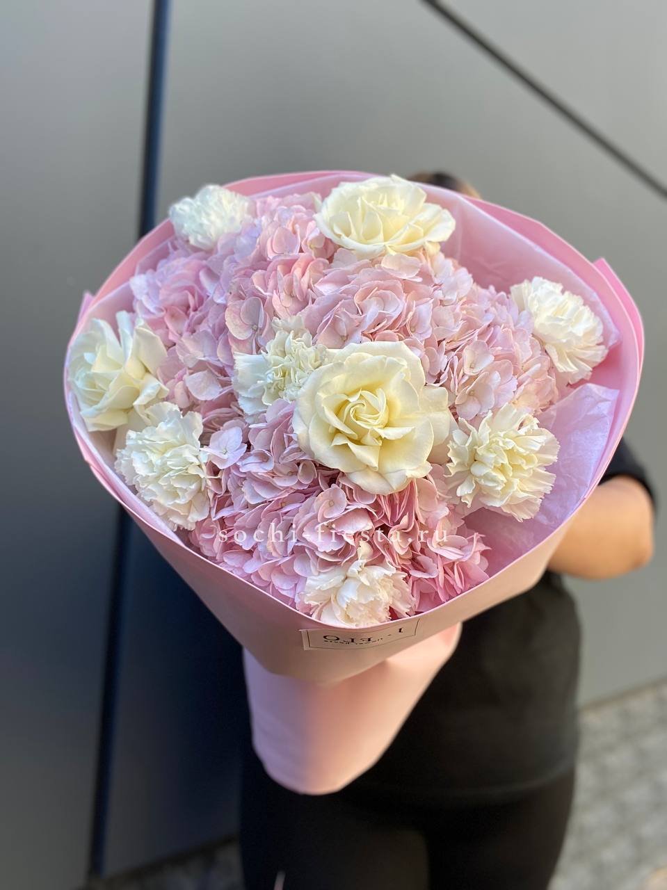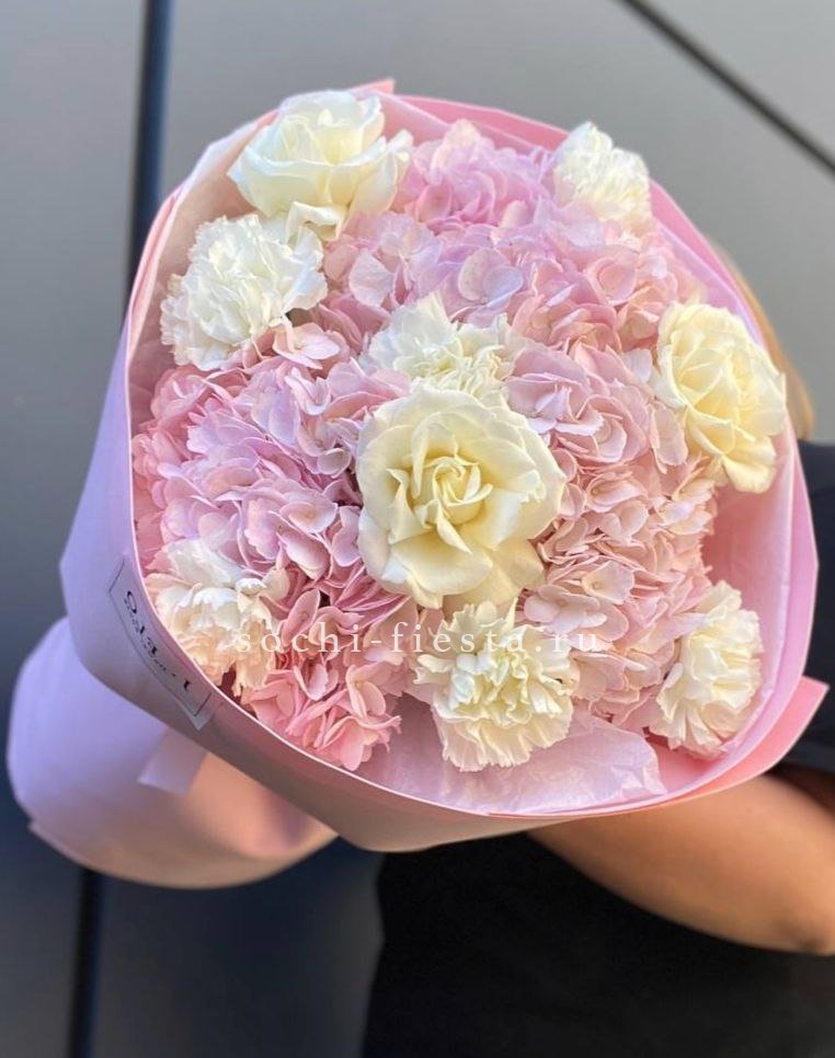 Крупные шапки гортензий формируют основу композиции, розы и эустомы заполняют пространство между ними. Диантусы добавляют графичности. Букет с впечатляющим присутствием и богатой палитрой.
