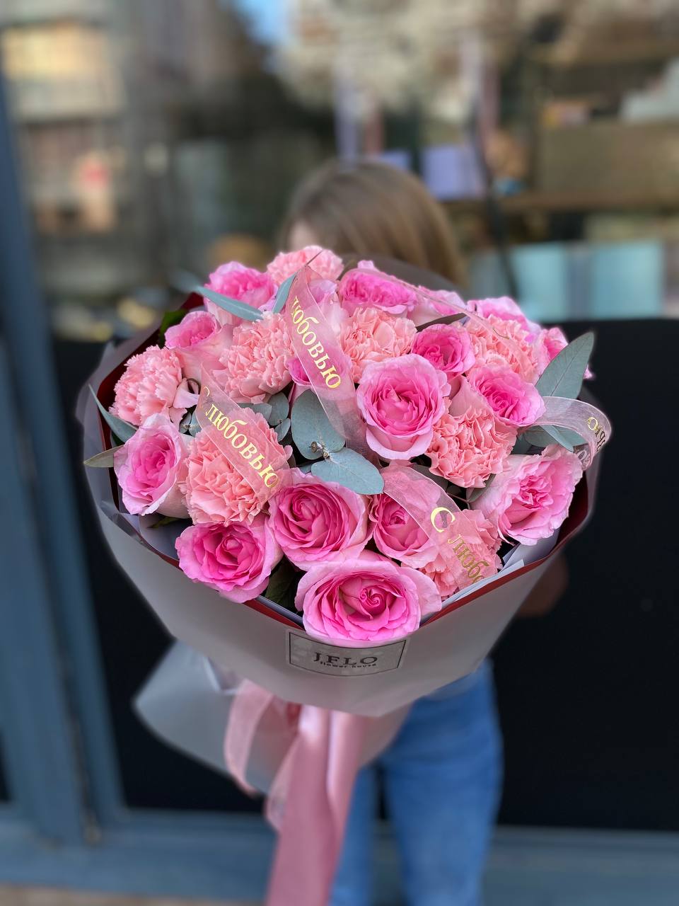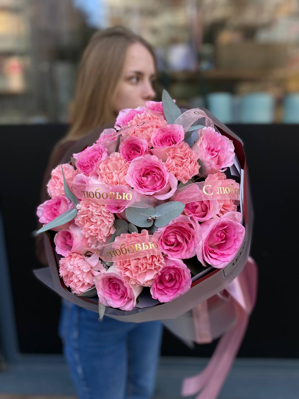 пионовидные розы, розовые розы, эвкалипт, лента, дизайнерская упаковка.
