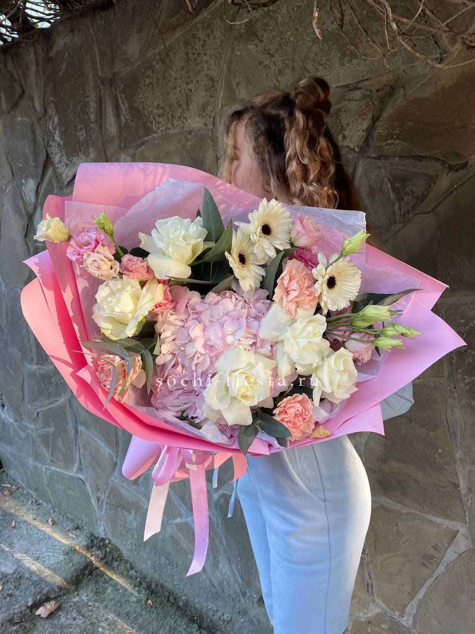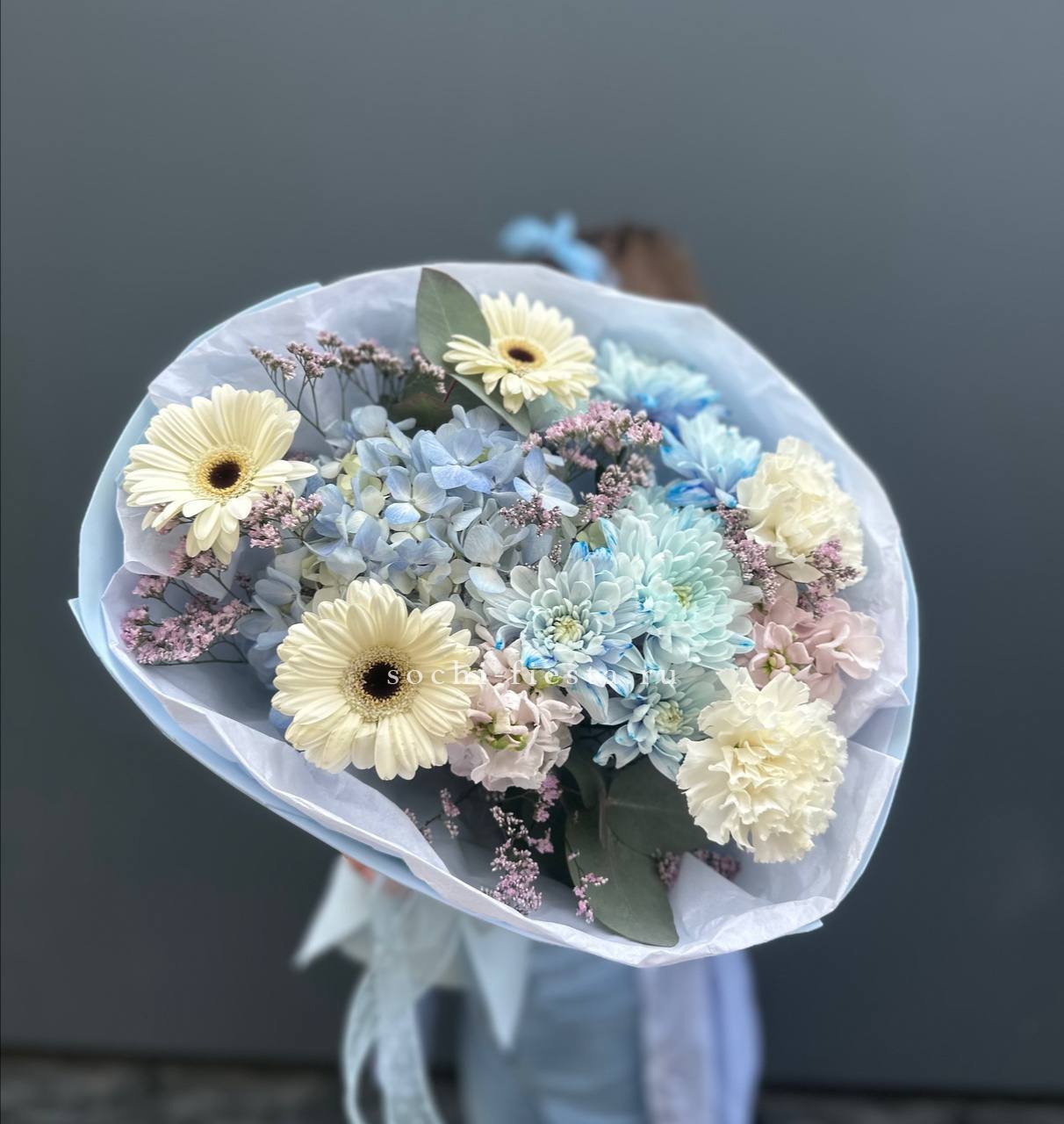 гортензия, розы джумилия, бомбастик, альстромерия, маттиола, чико, авторское оформление.
