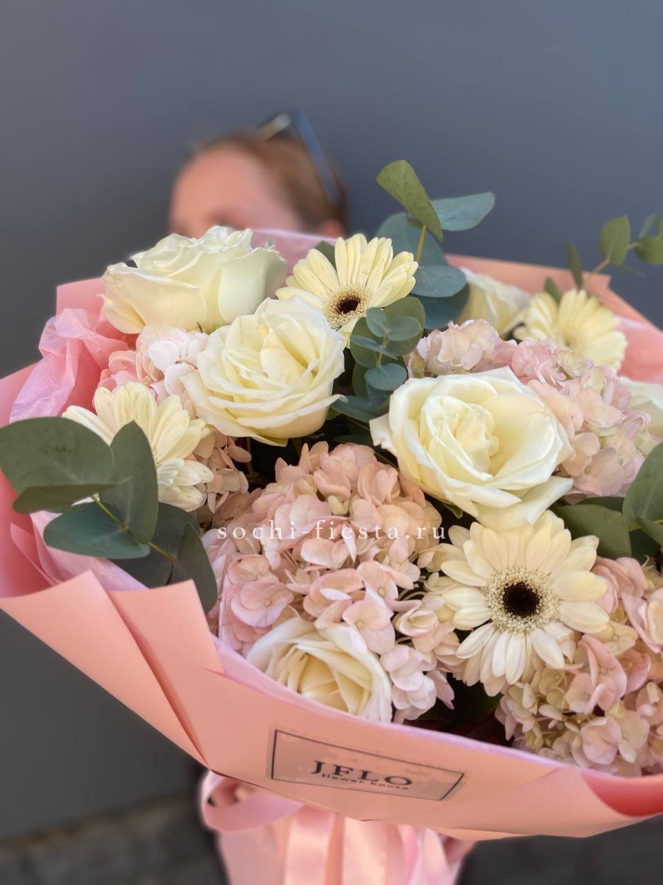 гербера, роза, гортензия, упаковка.