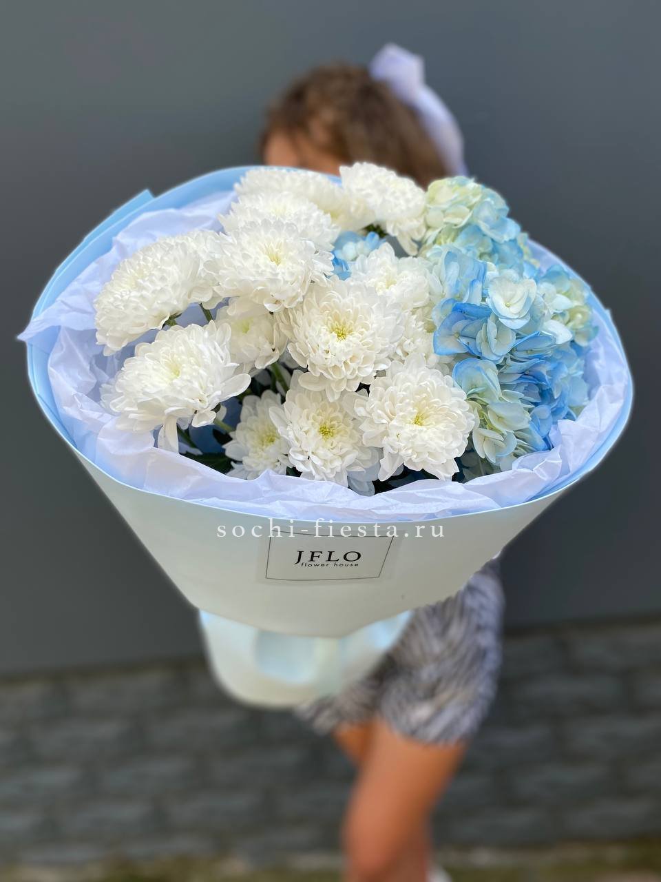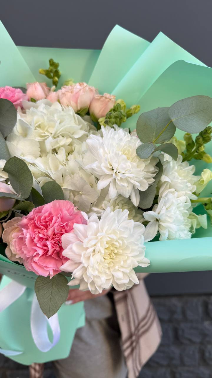 Мисти Баблс раскрывается плотными лепестками среди белоснежной гортензии и эустомы. Композиция построена на игре фактур — от крупных бутонов до мелких соцветий кустовой розы.