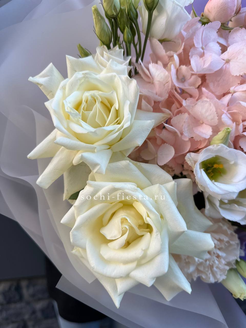 пионовидные кустовые розы мисти бабблс, белые розы, розовые розы, лента, дизайнерская пленка.