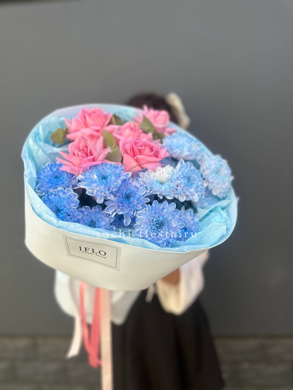 Французские розы и кустовые хризантемы собраны в букет с плотной текстурой и мягким переходом оттенков. Композиция держит форму и долго сохраняет свежесть.