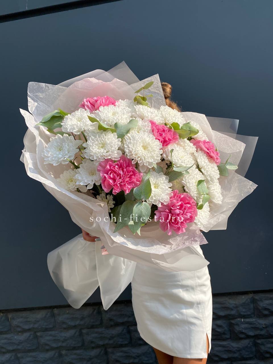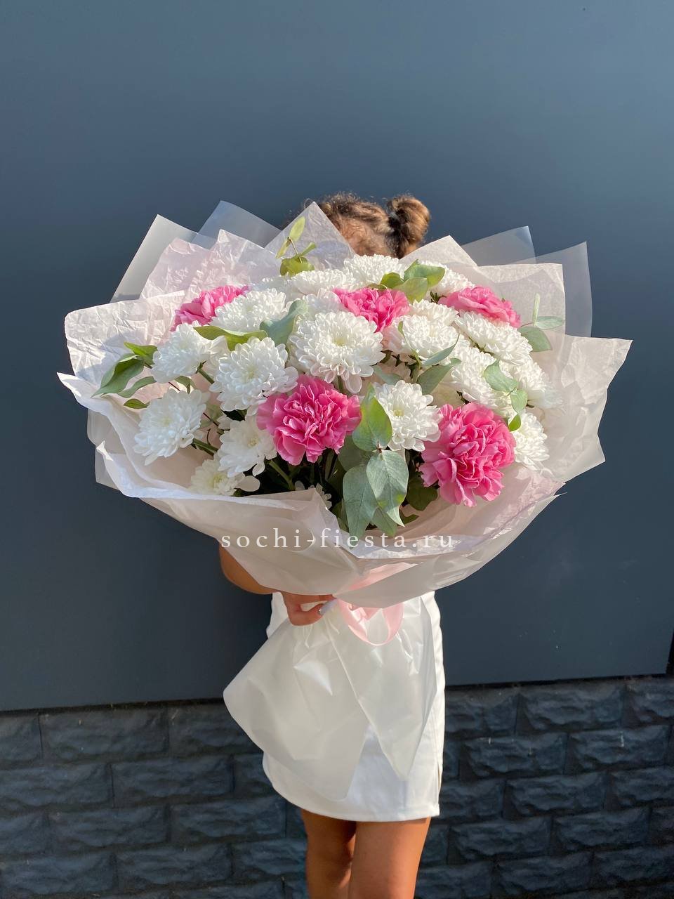 гортензия, диантус, хризантема, эустома, розы, озатамус, пленка.