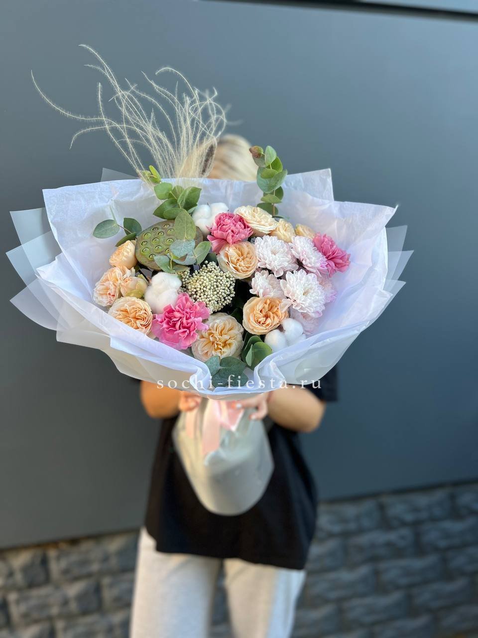 Экзотический лотос встречается с пушистым хлопком и кустовыми розами пионовидной формы. Ковыль добавляет воздушности, а озатамус создает природную текстуру. Композиция для тех, кто ценит необычные сочетания растений.