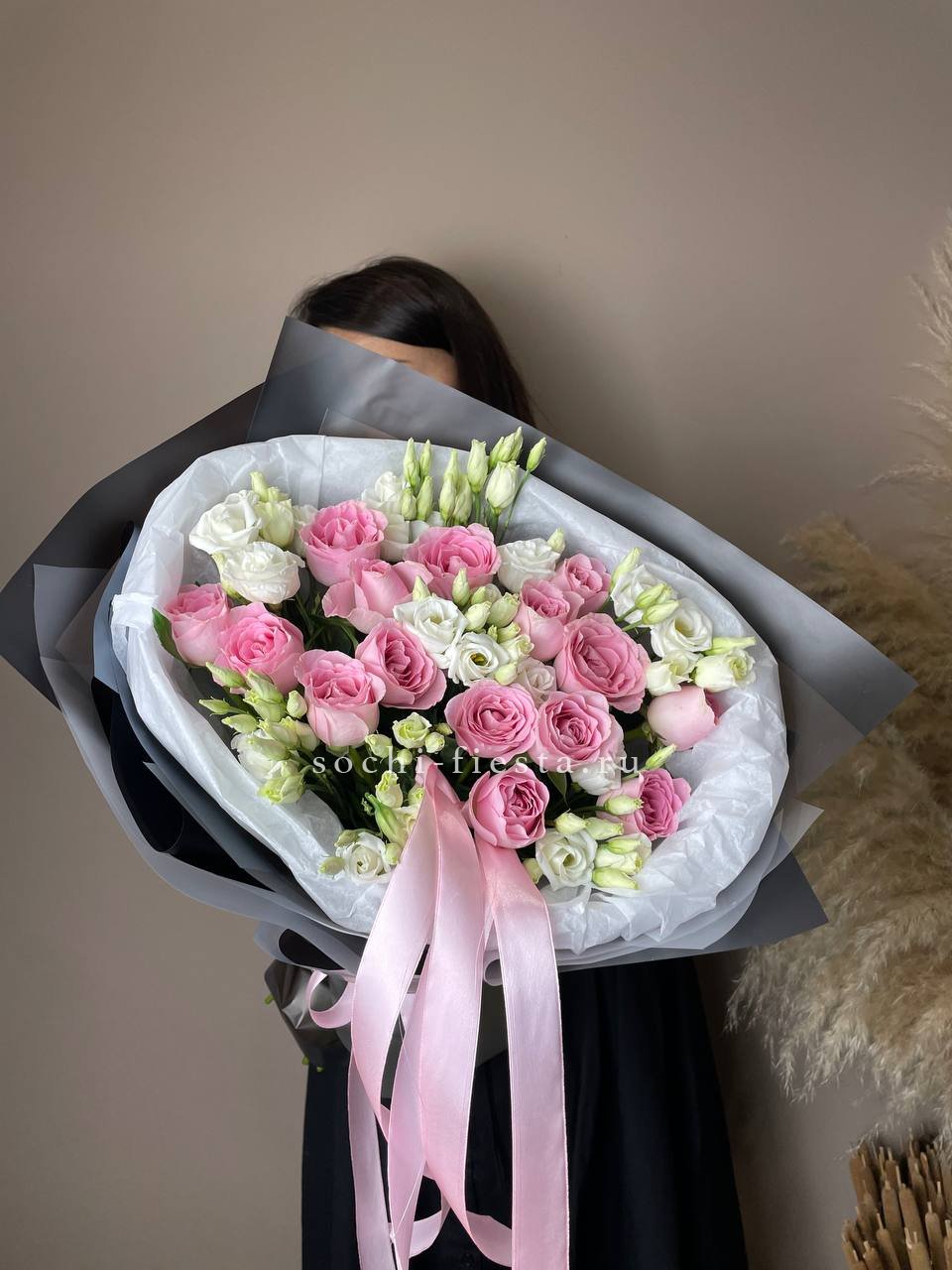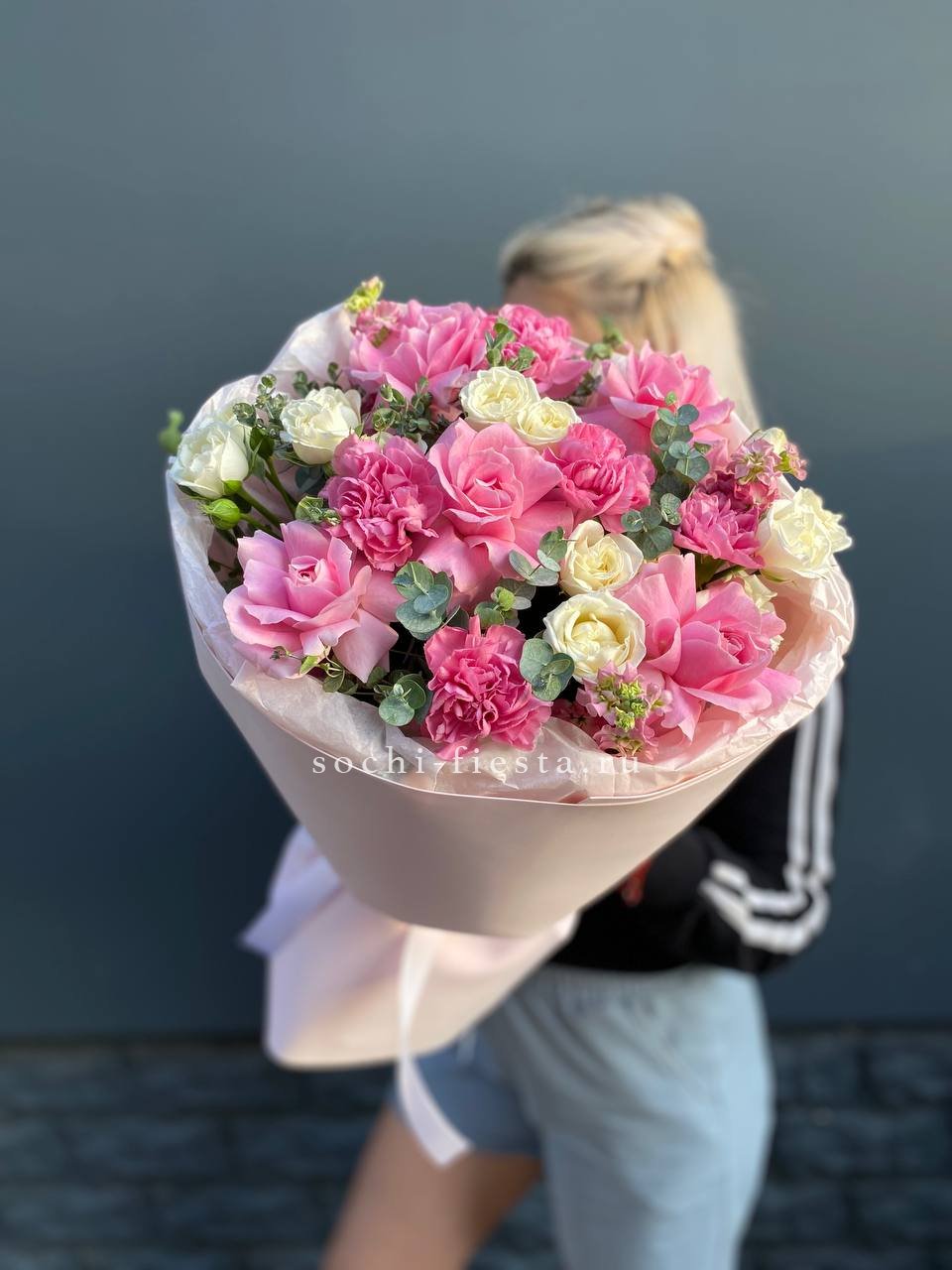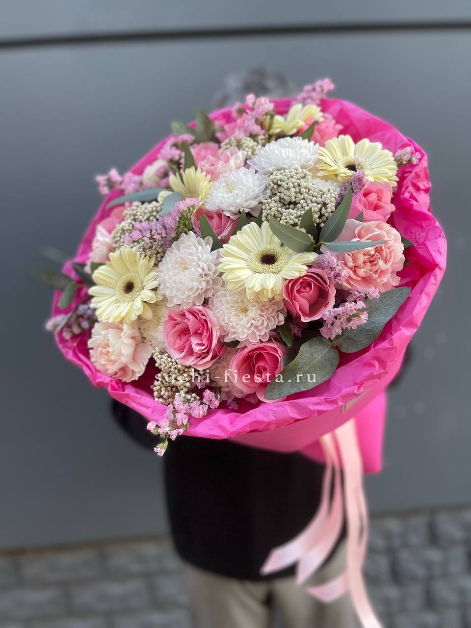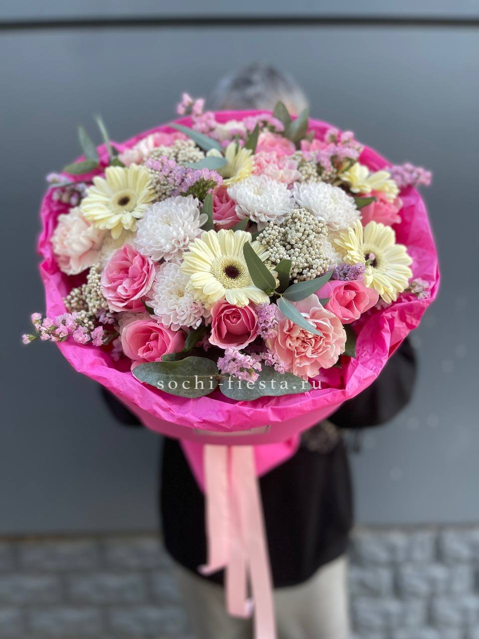 Розовые розы и диантусы окружены пышными соцветиями маттиолы и бомбастика. Композиция собрана плотно, каждый цветок поддерживает соседний, создавая объемную округлую форму. Букет держит силуэт и выглядит цельно с любого ракурса.