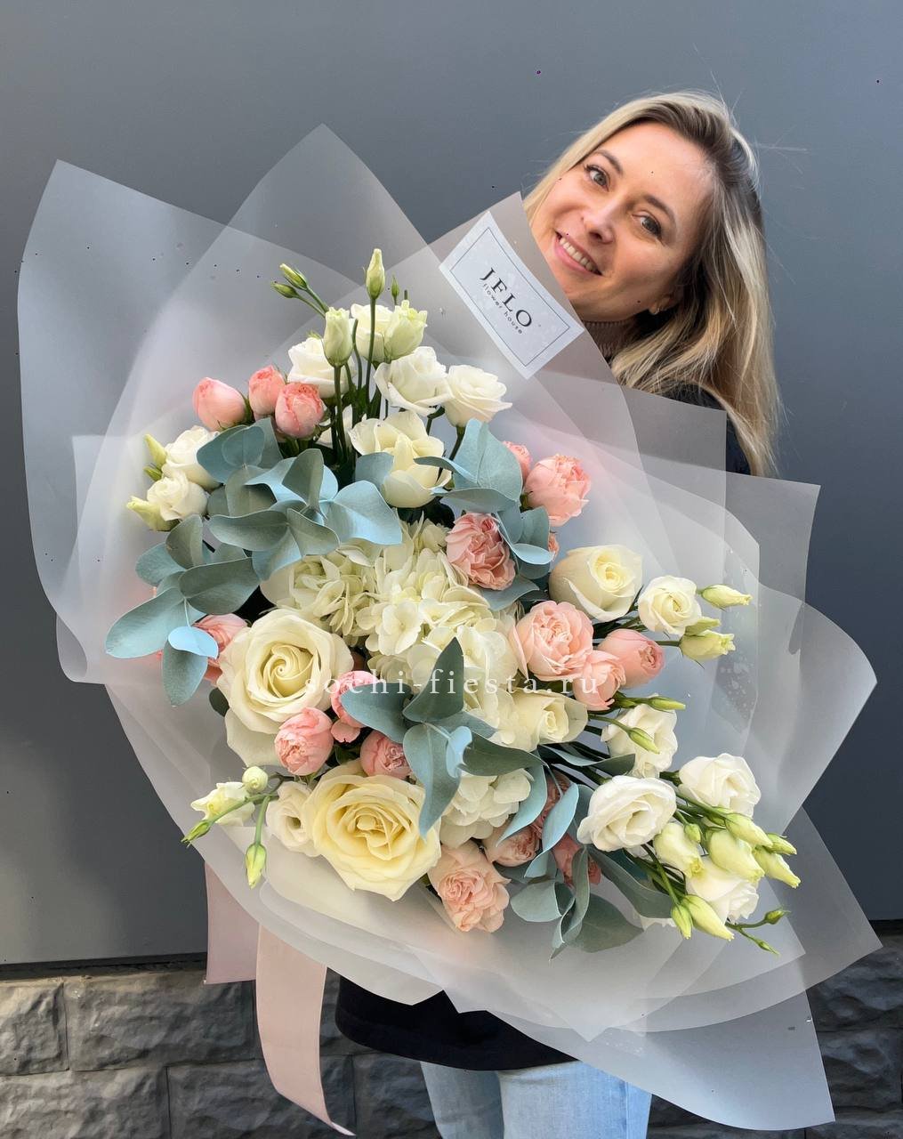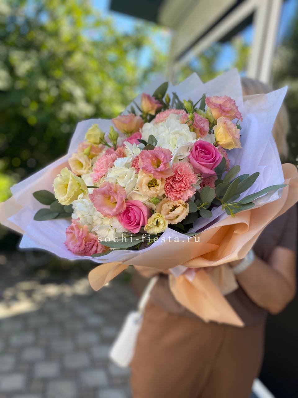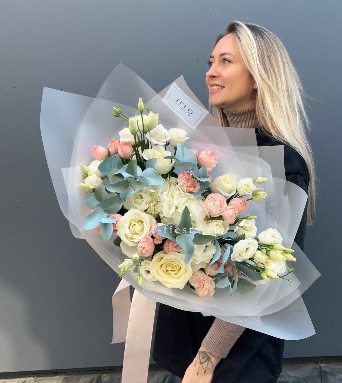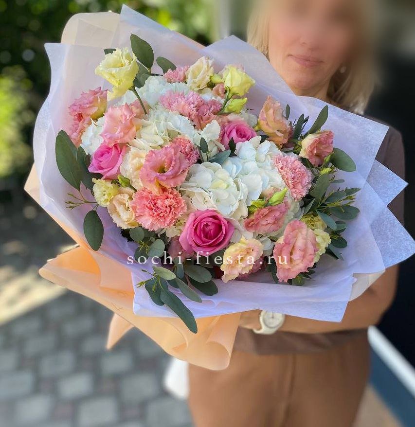 гортензия, белая роза, диантус, хризантема, эустома, озатамус, пленка.