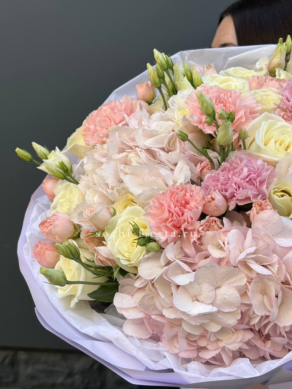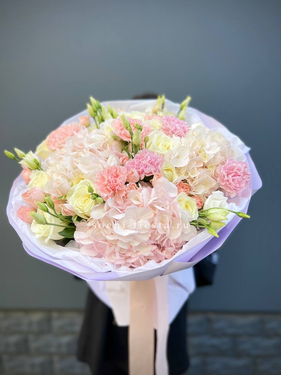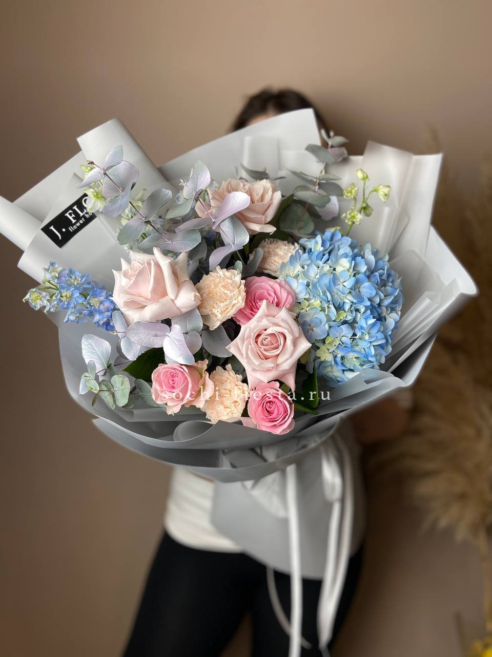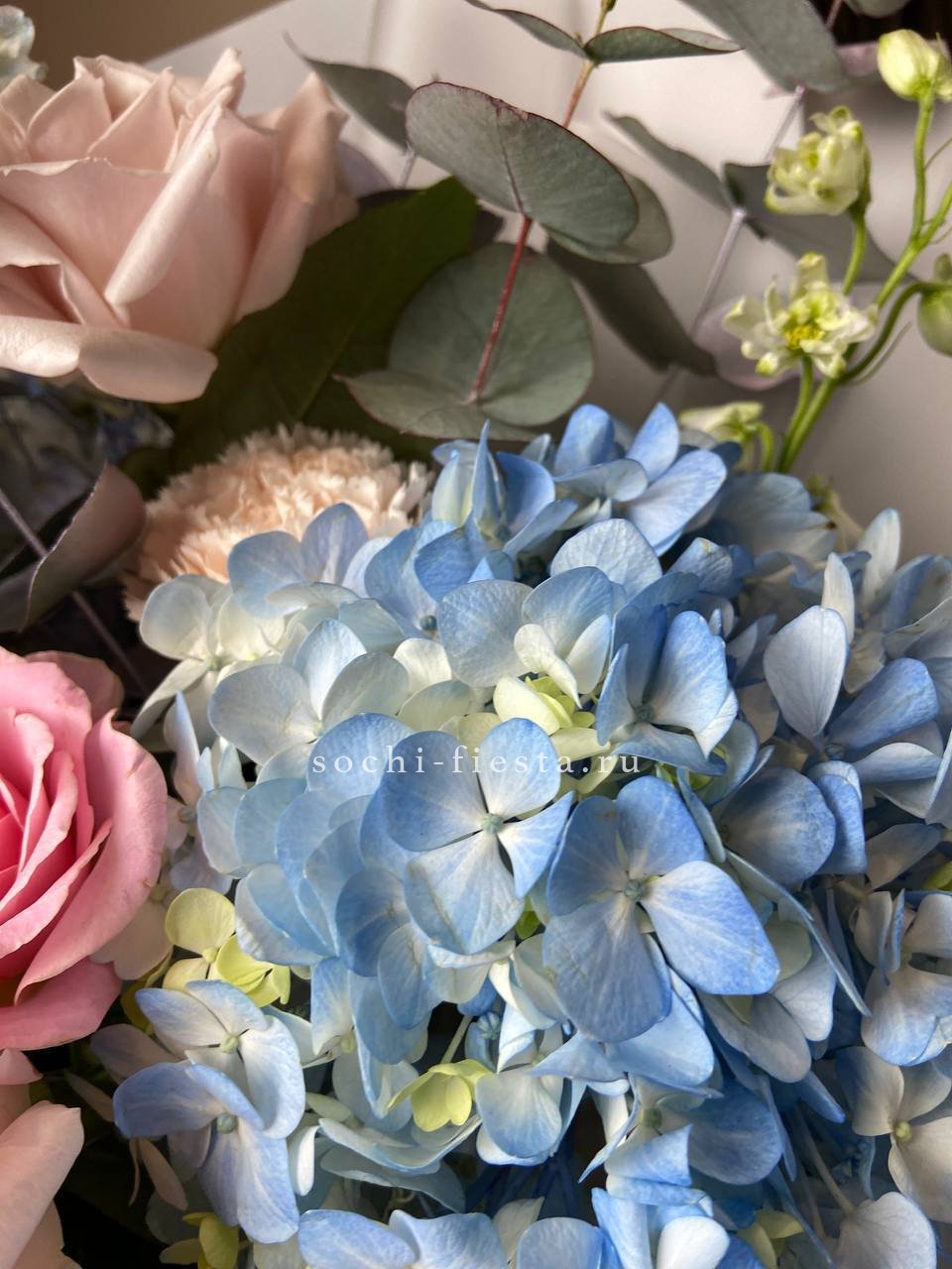 Воздушная композиция с крупными соцветиями гортензии и пышными розами создает ощущение легкости и объема. Эвкалипт добавляет свежести, а бомбастик расставляет яркие акценты между бутонами.