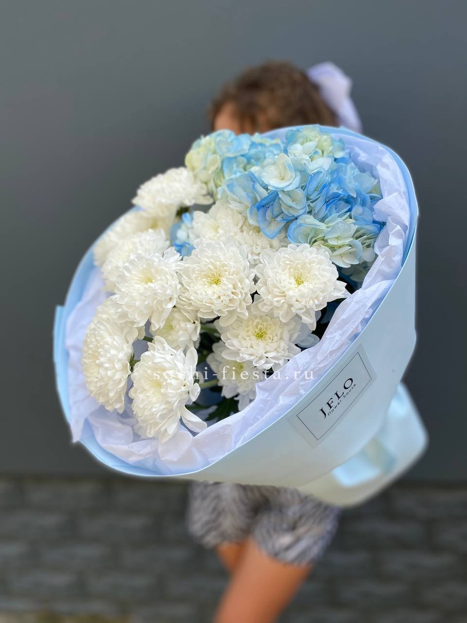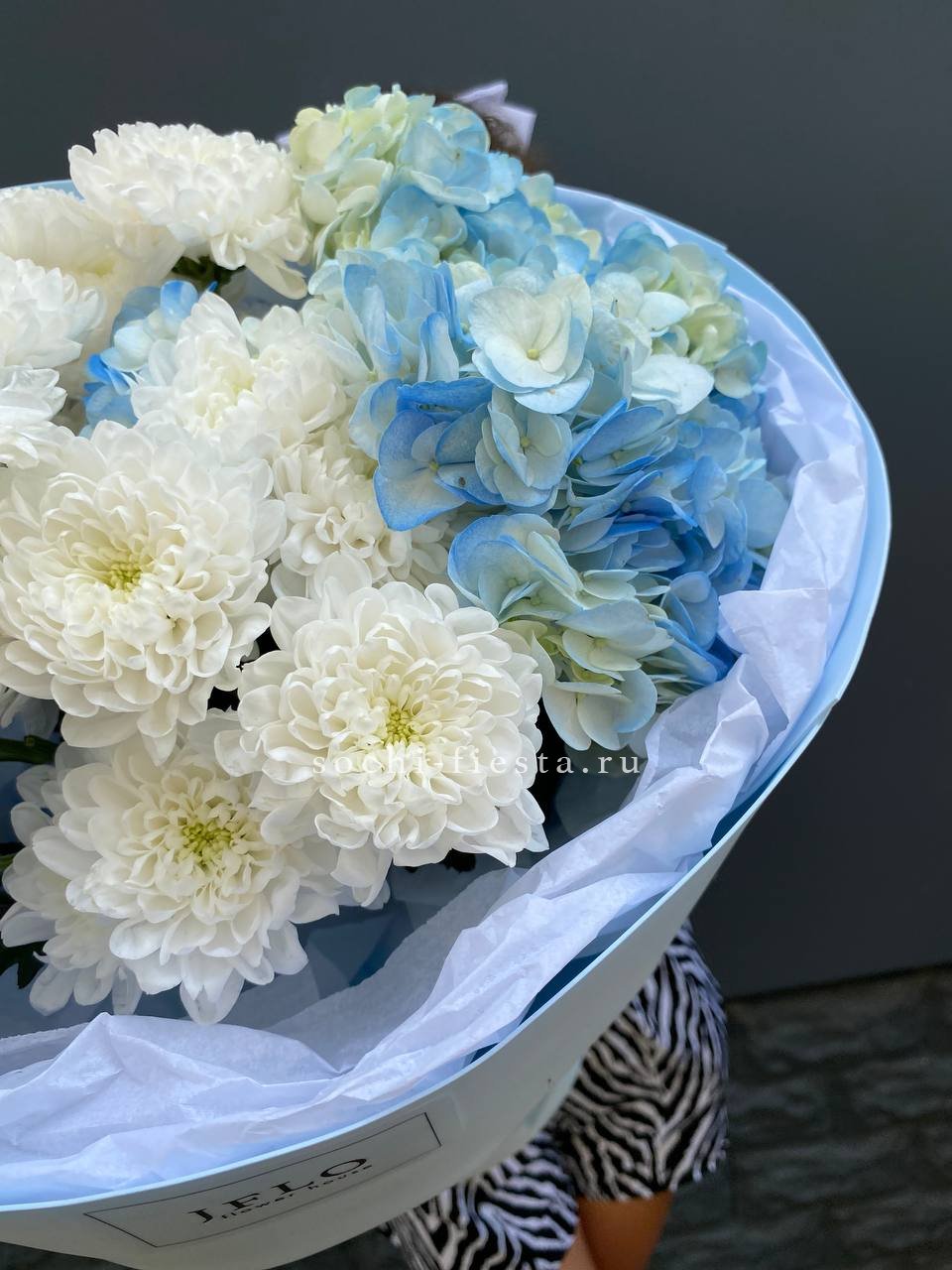 гортензии, хризантемы, лента и дизайнерская пленка.