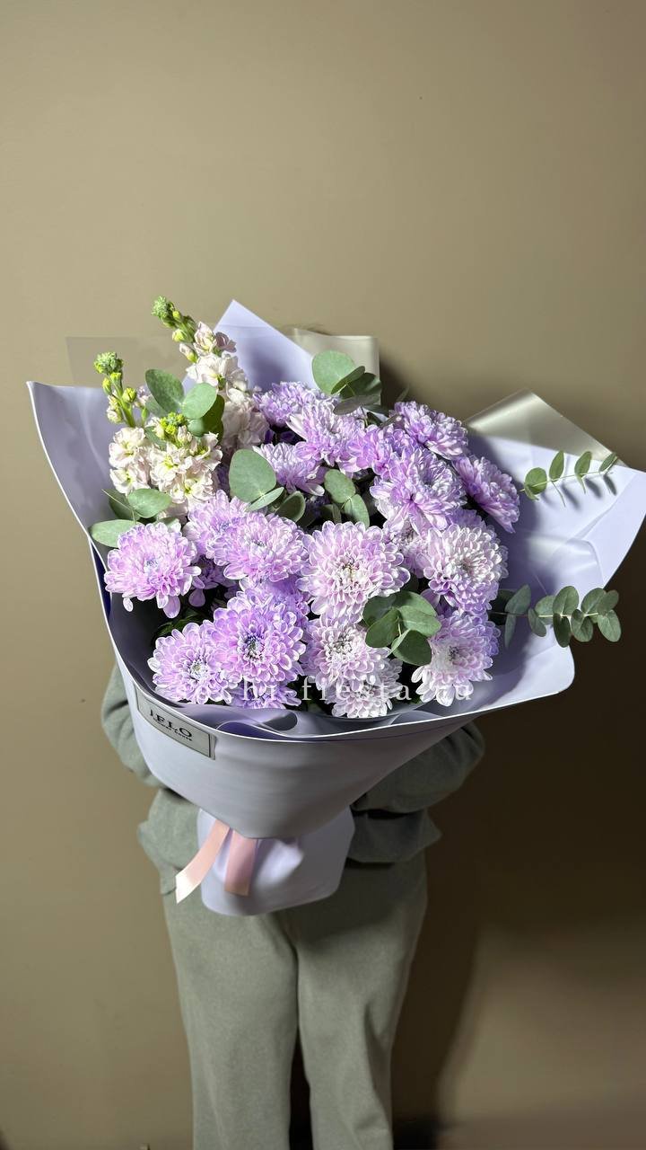 Гортензия задаёт пышную основу, а маттиола и лимониум наполняют букет текстурной глубиной. Французские розы и ковыль создают динамику, которая оживляет композицию и придаёт ей выразительность.