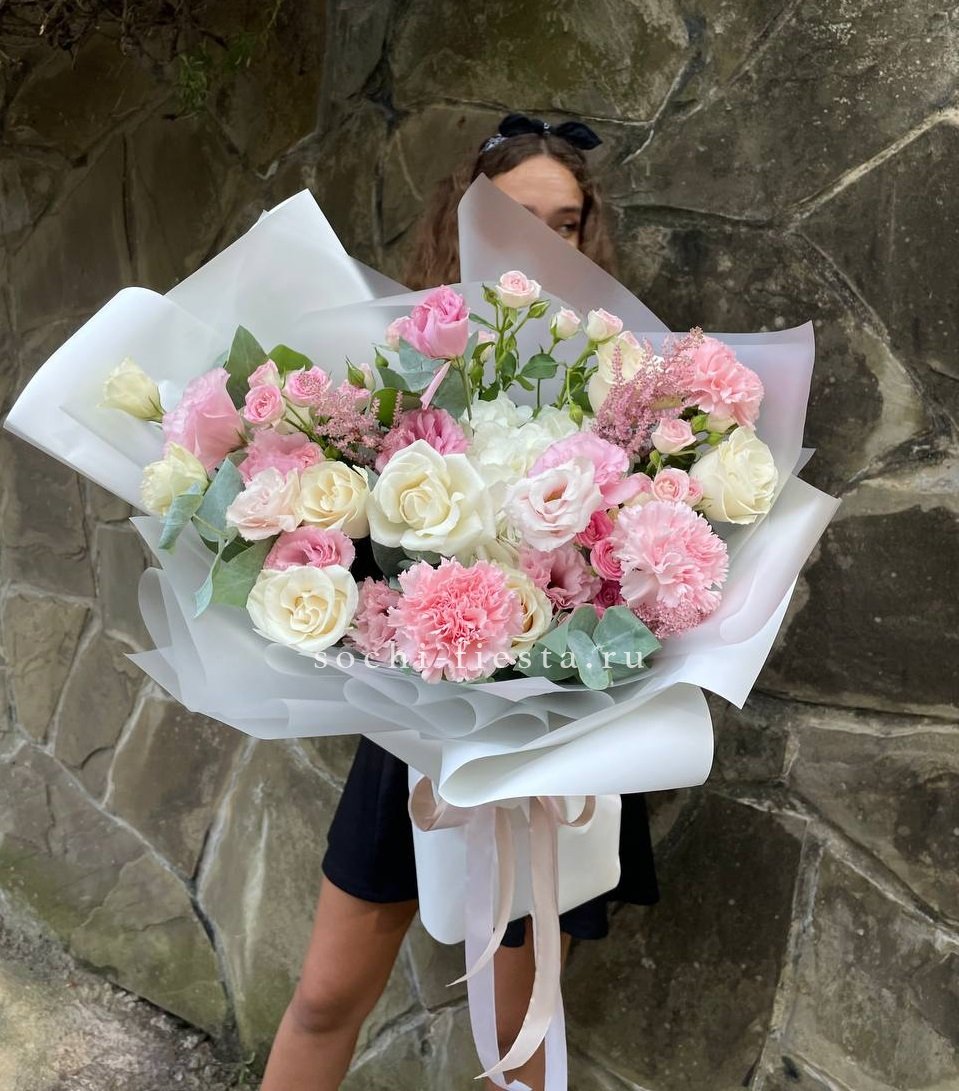 гортензия, роза, кустовая роза, диантус, эустома, дельфиниум, эвкалипт, лента, авторская упаковка.