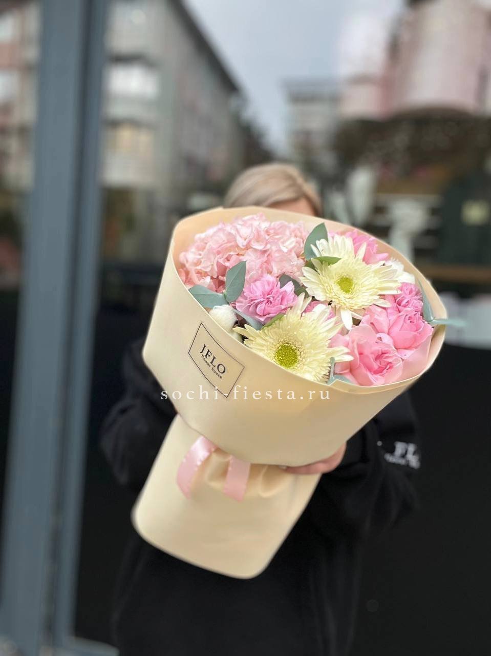 гербера, роза, хлопок, гортензия, диантус, эвкалипт, упаковка.