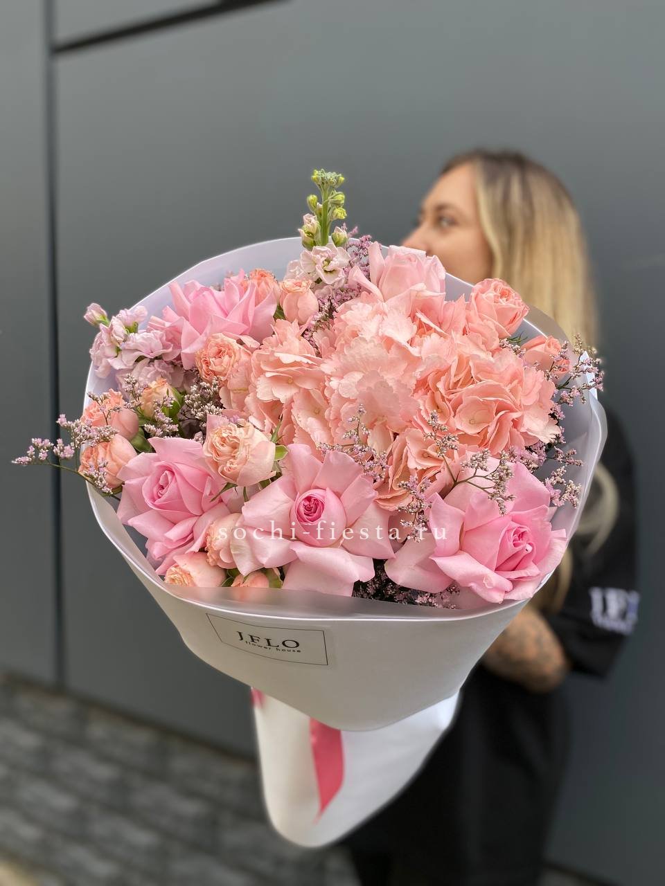 гортензия, розовые розы, кустовые розы, маттиолы,, лимониум лента и дизайнерская пленка.