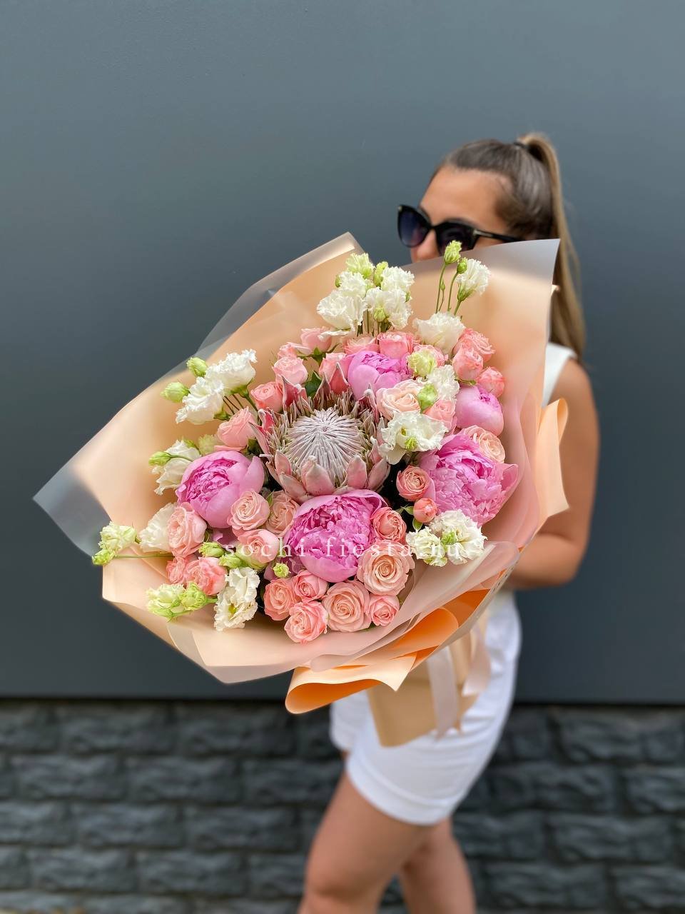 Пышные пионы окружены воздушными эустомами и миниатюрными кустовыми розами, а экзотичная протея добавляет композиции выразительный акцент. Бархатистые лепестки чередуются с полураскрытыми бутонами, создавая объёмную фактуру и глубину букета.