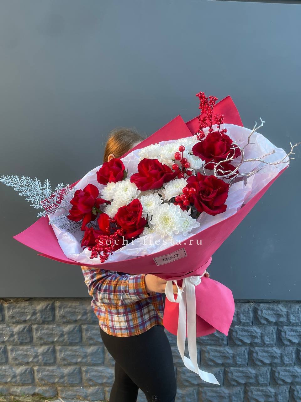 Красные розы и хризантемы звучат ярко и насыщенно в этой зимней композиции. Праздничный декор добавляет настроения, а плотная форма букета создает выразительное присутствие. Для тех моментов, когда нужен цвет и энергия.