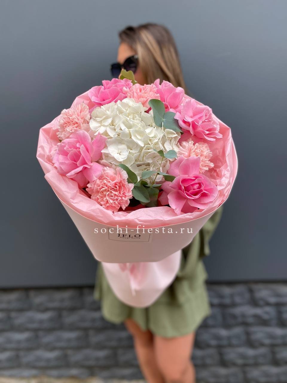 роза одноголовая, кустовая роза, альстромерия, гортензия, эустома, эвкалипт, декоративная зелень, лента, крафт.