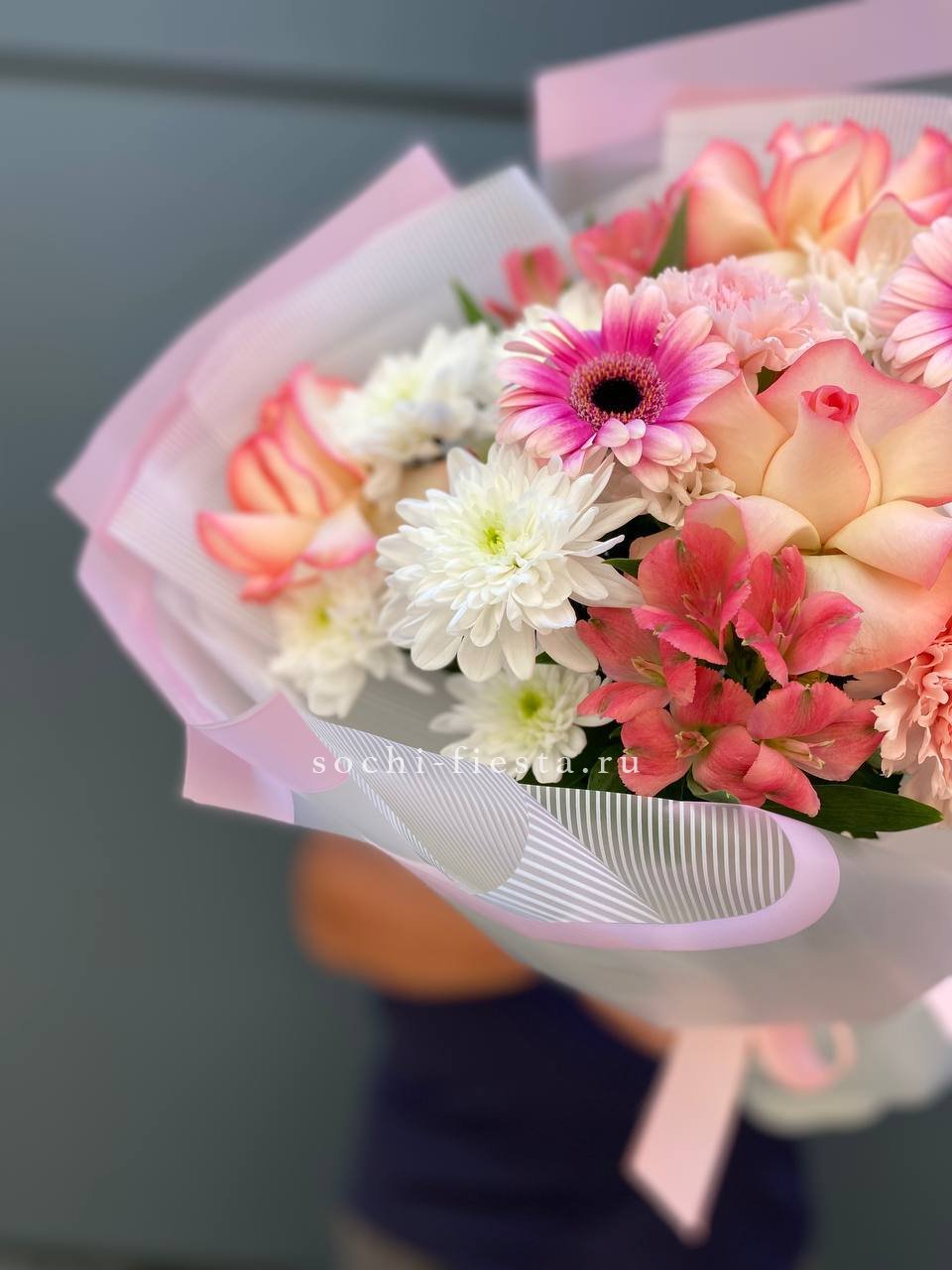 хризантема кустовая, гербера, роза французская, диантус, альстромерия, лента, дизайнерская пленка.