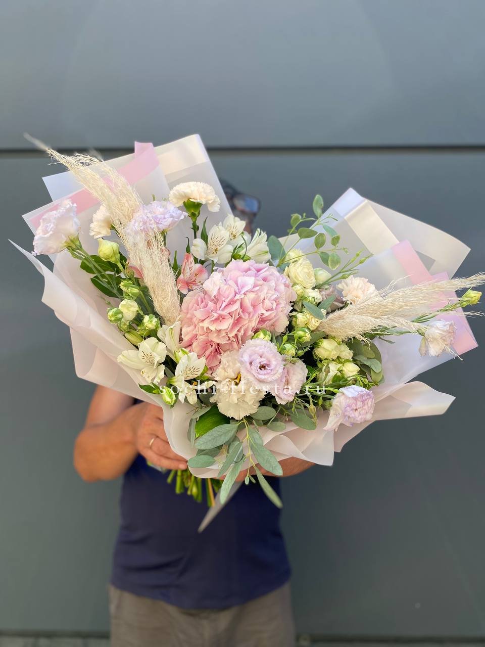 гортензия, эустома, кустовая пионовидная роза, альстромерия, диантус, лента, дизайнерская упаковка.