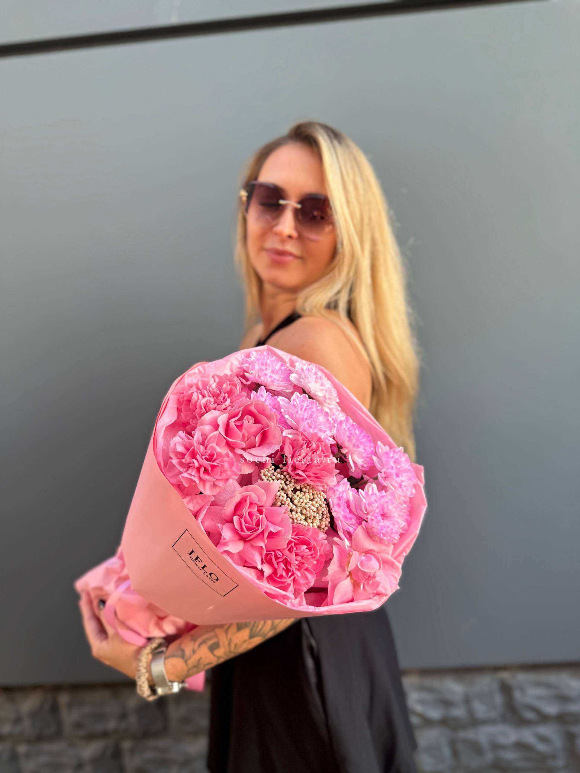 Пышная шапка из роз двух оттенков с объёмной гортензией и воздушным диантусом создаёт мягкий переход от белого к розовому. Бомбастик добавляет букету плотности, а эвкалипт освежает общую композицию. Универсальное решение для яркого поздравления.