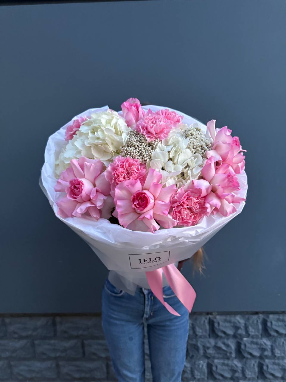 Лёгкая композиция с гортензией и гвоздикой дарит ощущение весеннего утра. Цветы подобраны так, что букет выглядит непринуждённо и свободно.