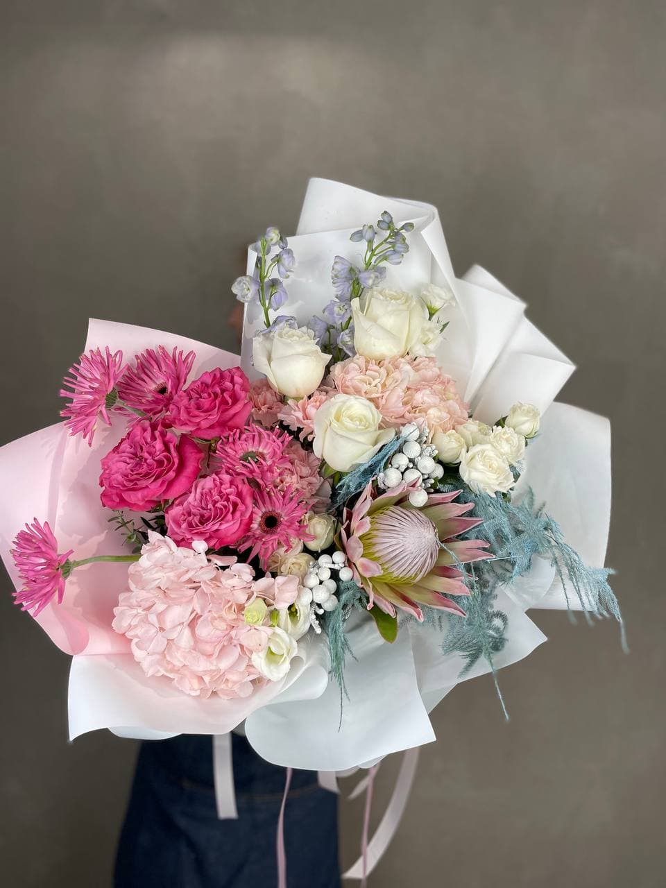 Гортензия и кустовые розы соединяются с веточками эвкалипта и ваксфлауэра в свободной композиции. Разная плотность соцветий создаёт живой ритм и природную лёгкость.