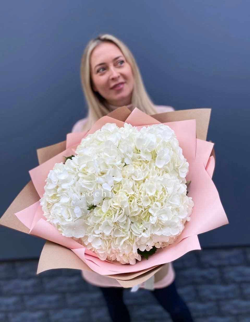 Семь белоснежных соцветий собраны в плотный объёмный силуэт. Гортензии Flakes создают ощущение летней свежести и спокойной гармонии. Монобукет для тех, кто ценит чистоту формы и природную красоту.