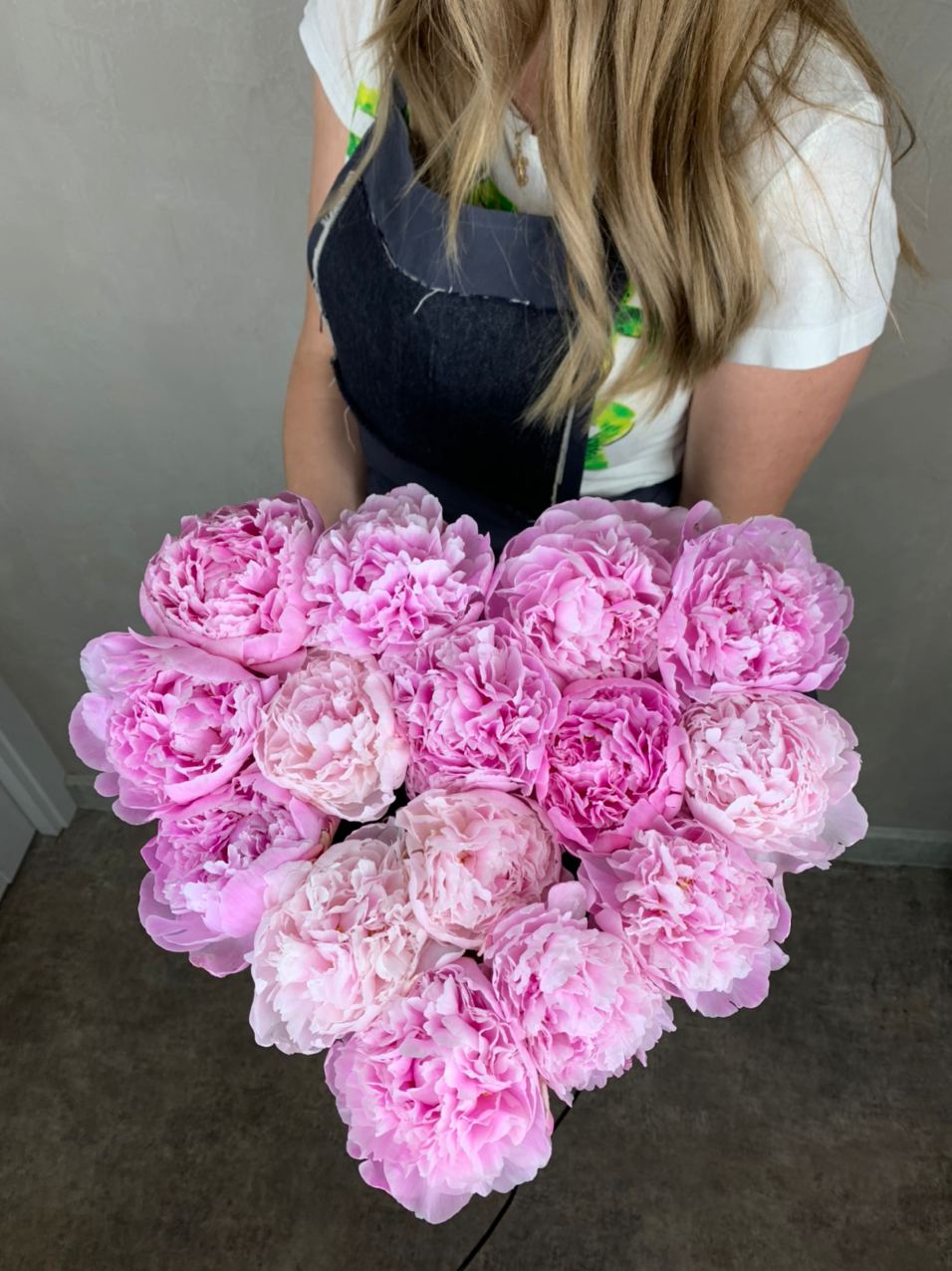 Пятнадцать пионов наполняют деревянный ящик плотной волной бутонов разной степени раскрытия. Композиция держит форму и притягивает взгляд многослойной фактурой лепестков.