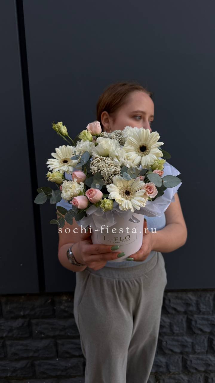 бокс из нежных розово-голубых цветов, розы, герберы, гортензии.
