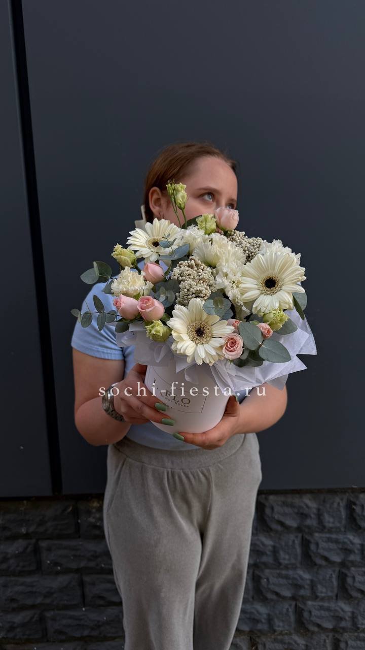 Розы, герберы и пышные соцветия гортензии в розово-голубой гамме наполняют бокс свежестью и легкостью. Каждый цветок раскрывается по-своему, создавая многослойную композицию. Готовое решение для яркого момента.
