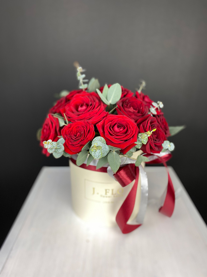 Композиция в коробке объединяет пышную гортензию, воздушную эустому и кустовые розы, Джумилию с яркими гербами и хлопком. Плотное заполнение создает округлую форму, где каждый цветок находит свое место без пустот.