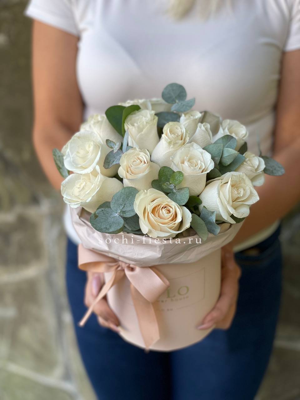 Белые лилии и кустовая роза встречаются с лотосом и диантусом в небольшом боксе. Эвкалипт добавляет свежести легкой водной палитре.