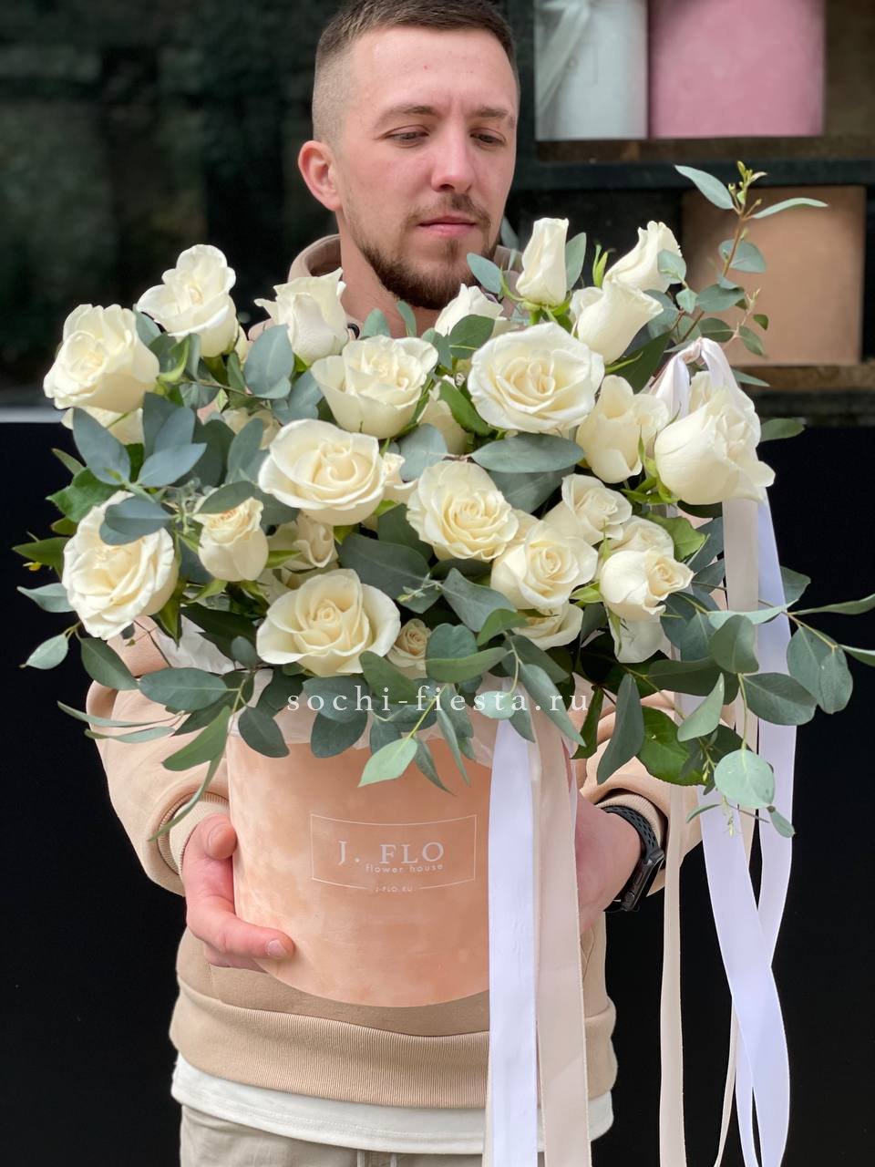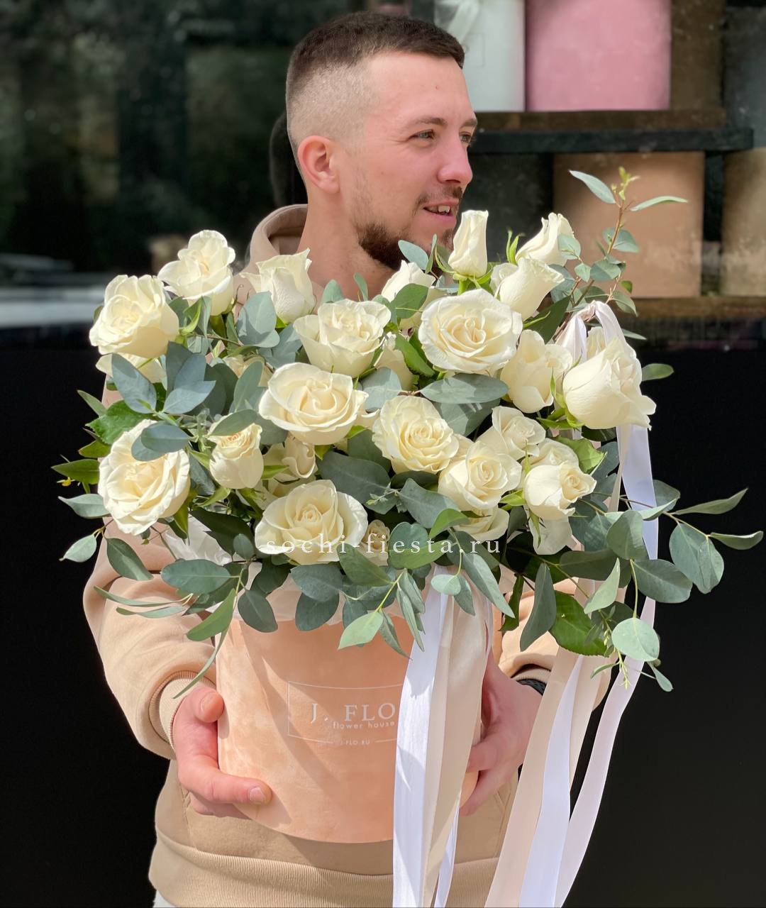 Пионовидная роза Бомбастик образует плотные бутоны с множеством лепестков. Эвкалипт добавляет свежести и завершает форму. Компактная коробка удобна для передачи из рук в руки.