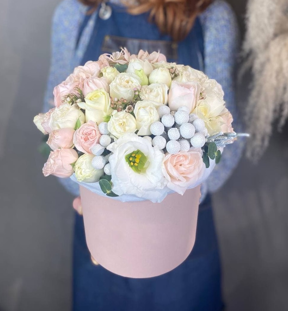 Цилиндр собран из пионов, роз и эустомы с добавлением диантусов и альстромерии. Амарант и эвкалипт создают объёмную текстуру. Композиция выразительна и хорошо держит форму.