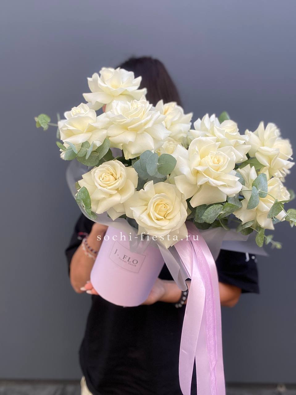 Эвкалипт обрамляет кустовые розы и гортензию, создавая многослойную структуру с зелеными переходами. Эустома добавляет легкости, а цилиндр держит форму аккуратной и собранной.