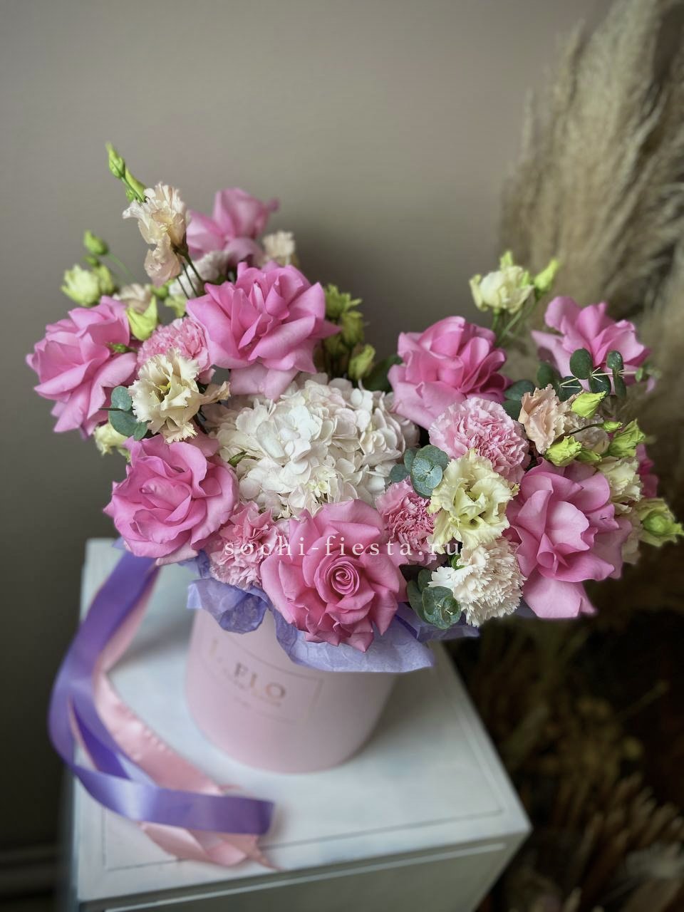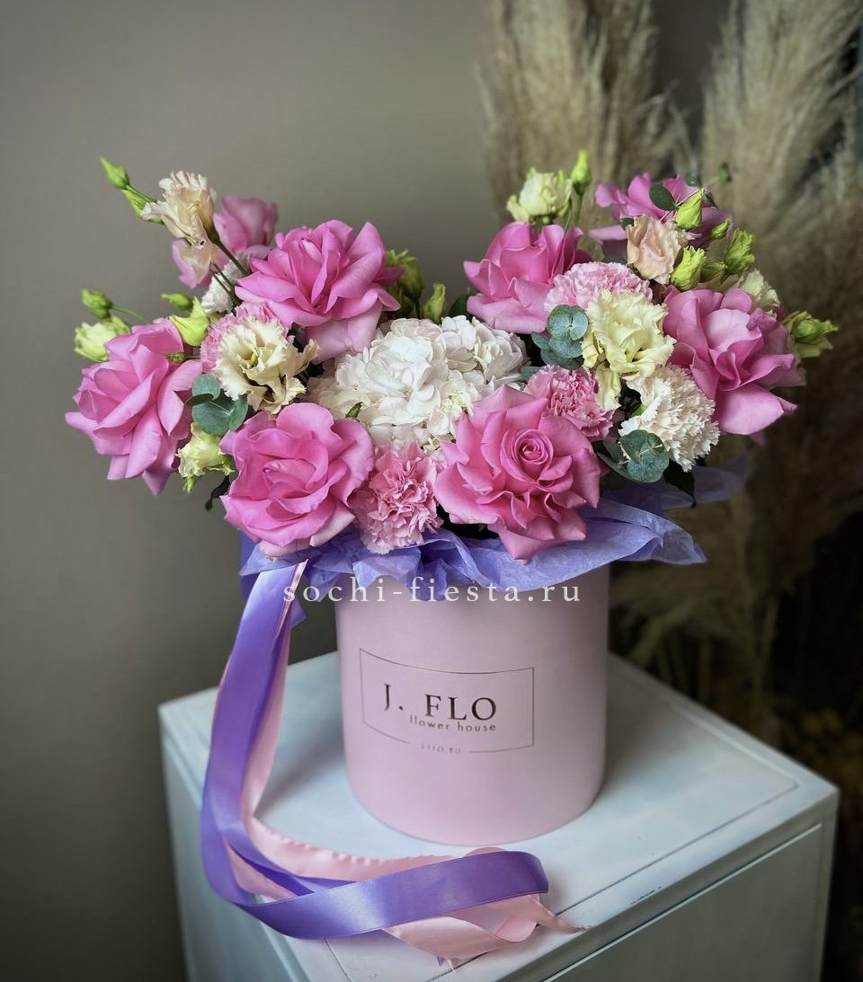 Гортензия создает пышную основу для французских роз и диантусов с эустомой. Цилиндр компактен и не требует дополнительной вазы. Розовая гамма раскрывается слоями от бледных до насыщенных оттенков.
