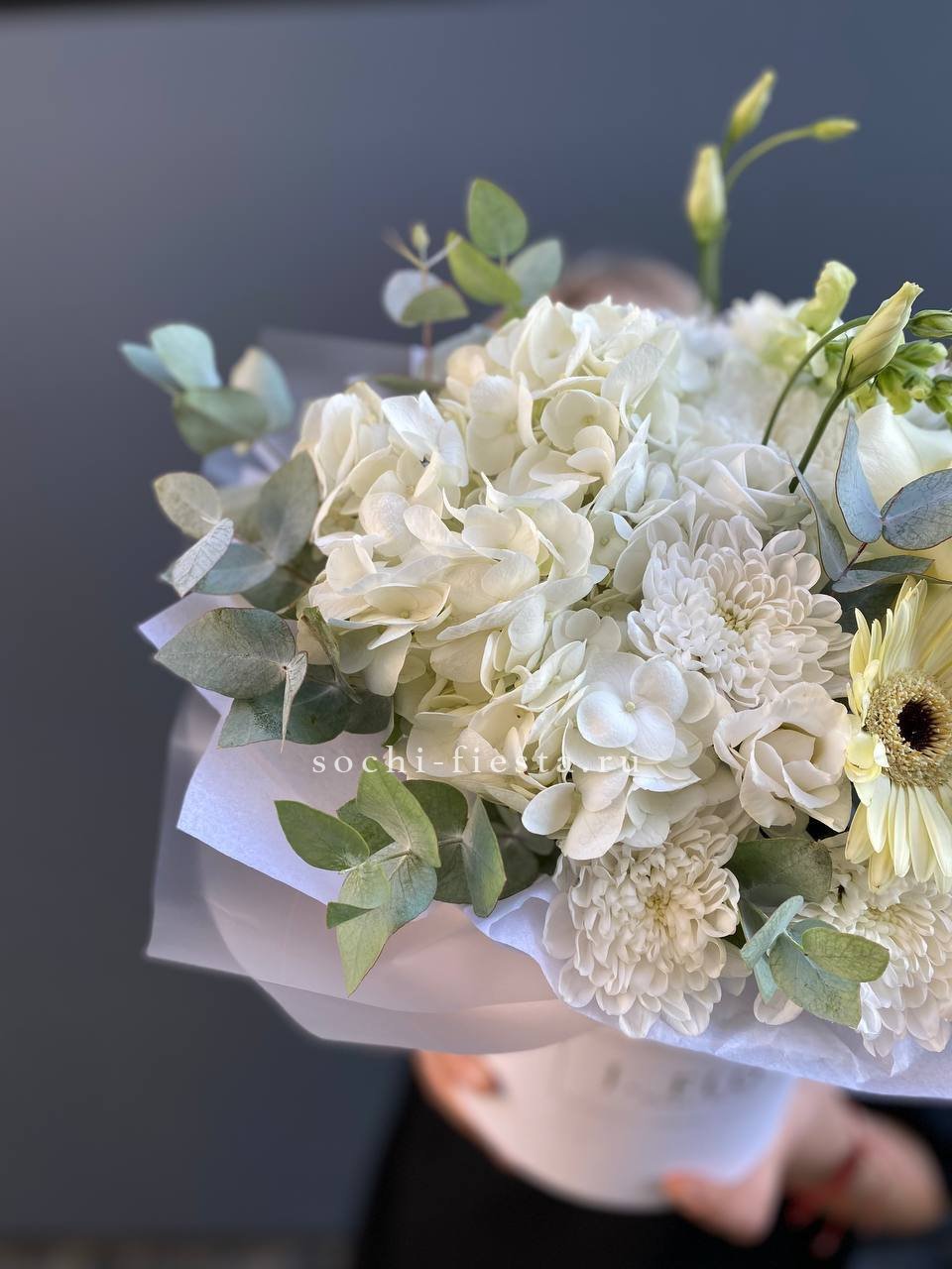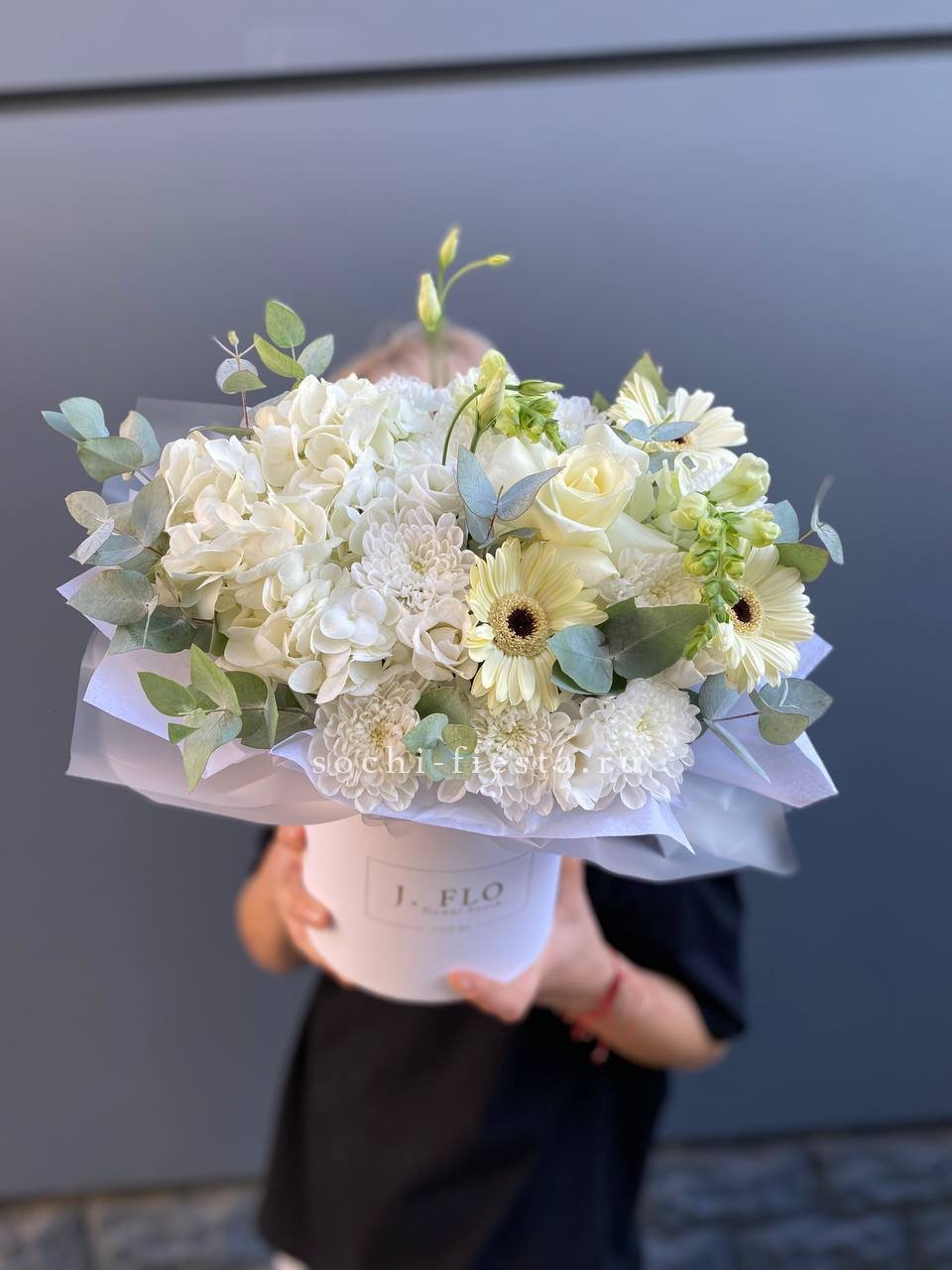 гортензия, французские розы, диантусы, эустома, цилиндр D16, бумага тишью.