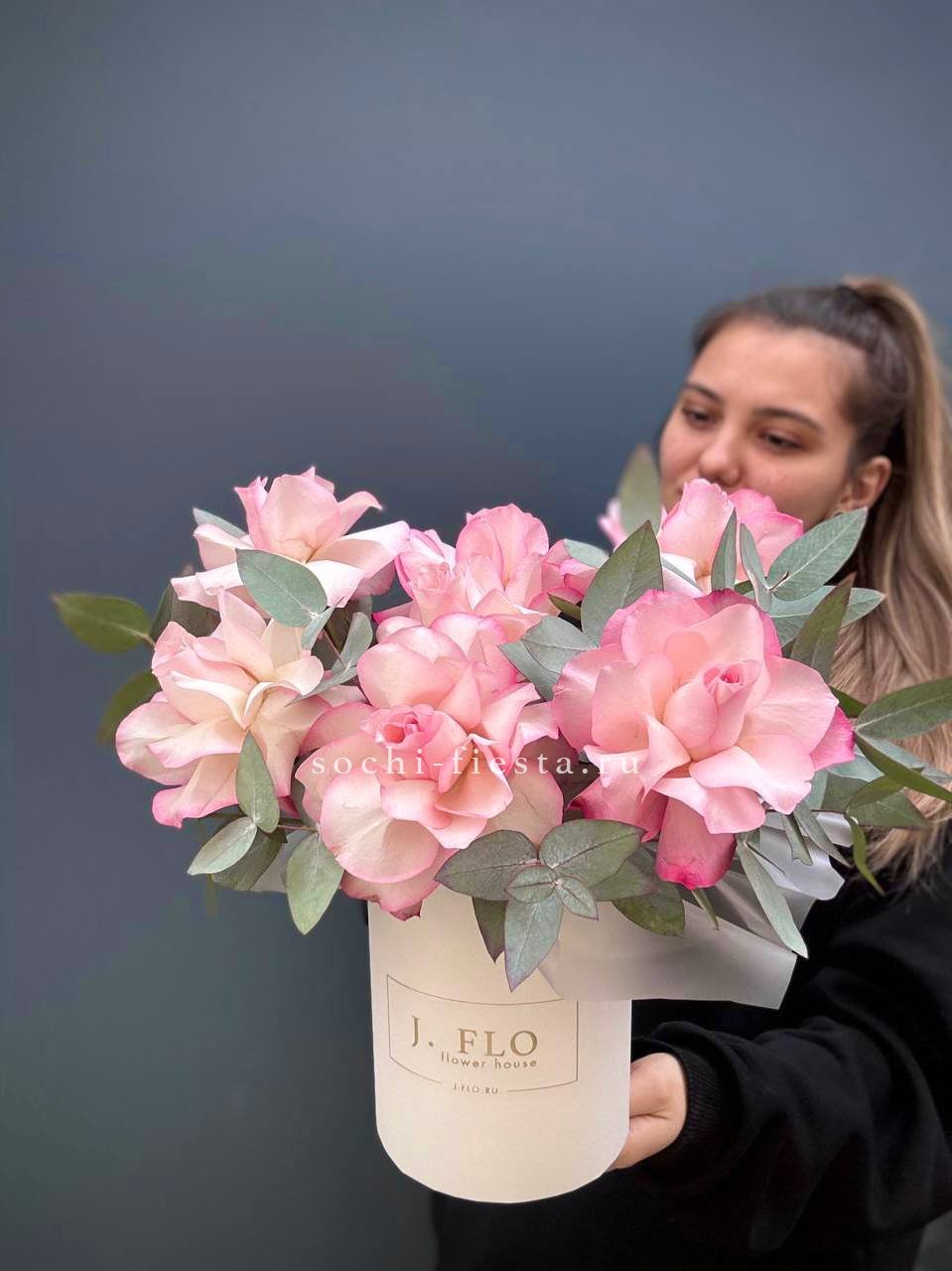 вывернутые белые розы, цилиндр D20, эвкалипт, лента, упаковка.