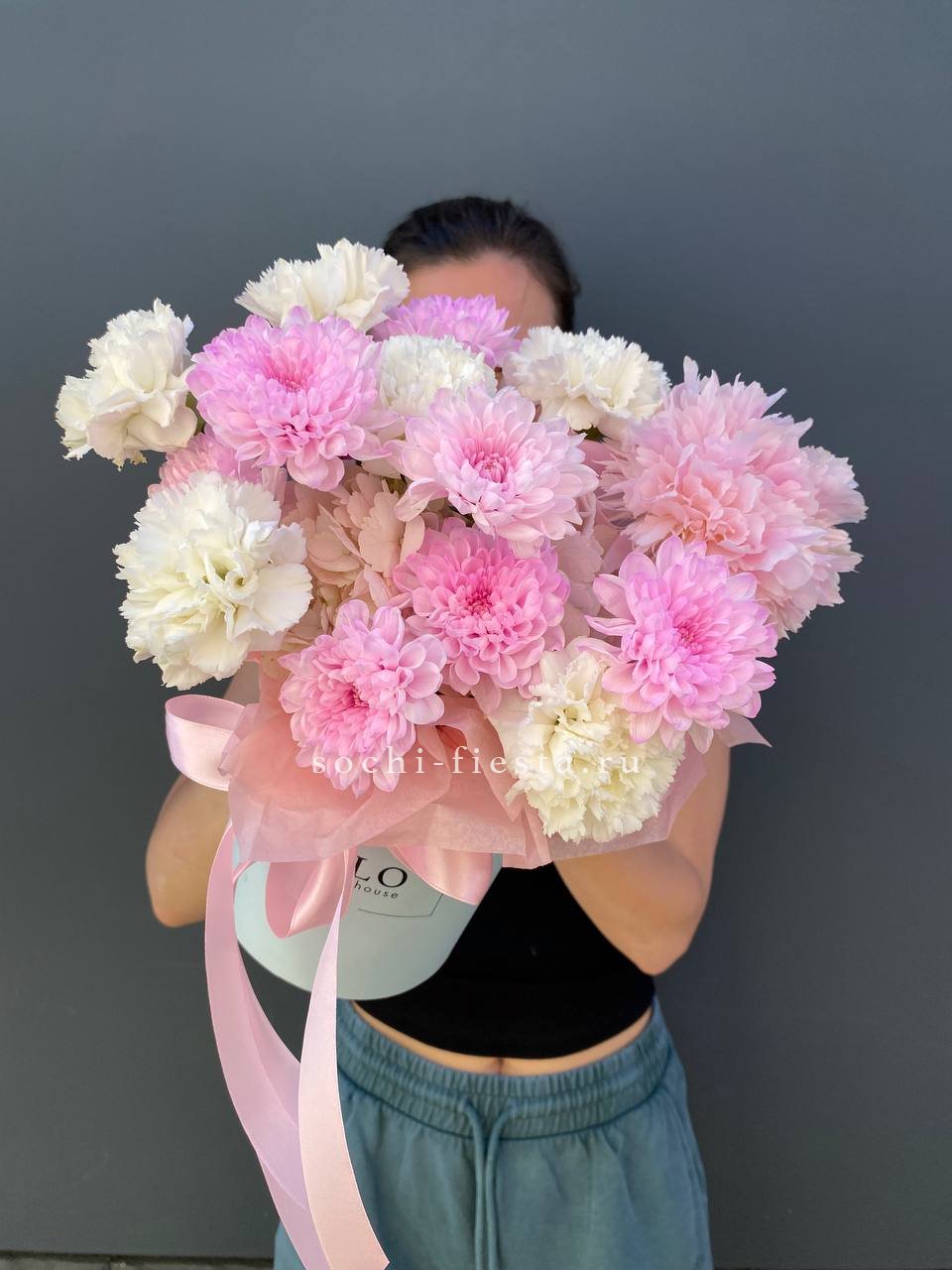хризантемы, диантусы, пионы, цилиндр D13, эвкалипт, лента, тишью.