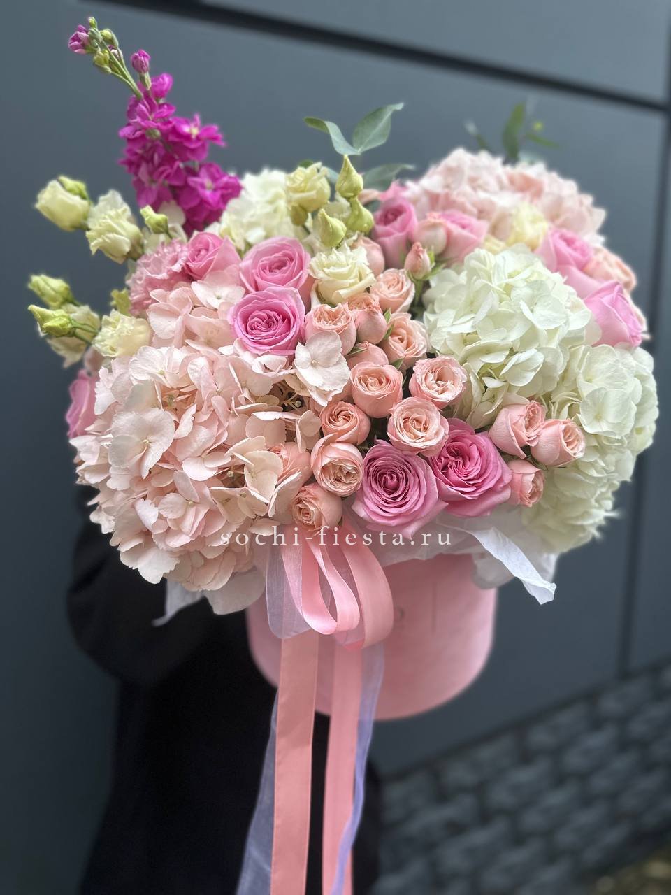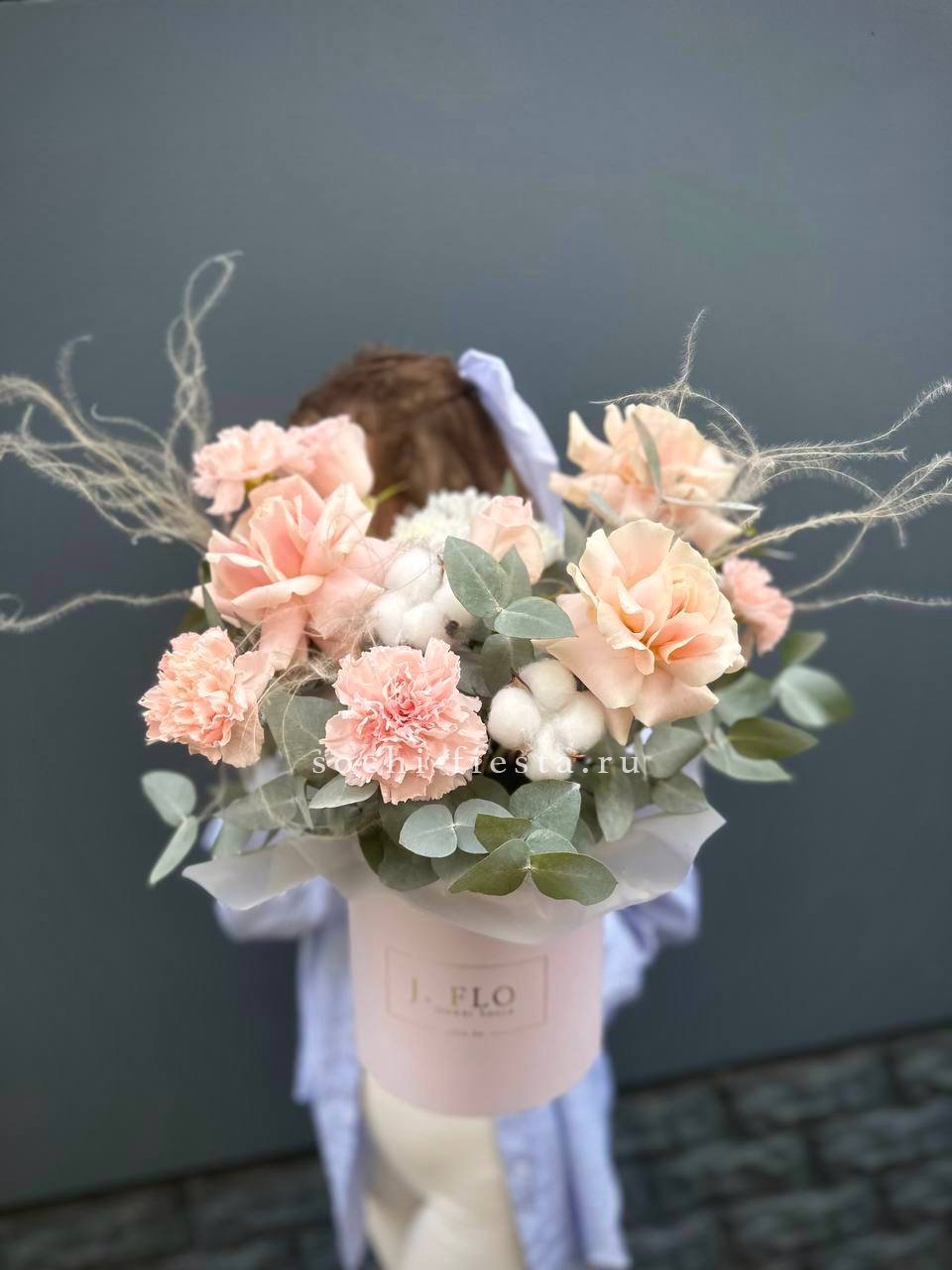Пионовидные кустовые розы собраны плотно, создавая объёмную композицию с живой текстурой. Лимониум и эвкалипт добавляют воздушности, а цилиндр собирает всё в компактную форму.