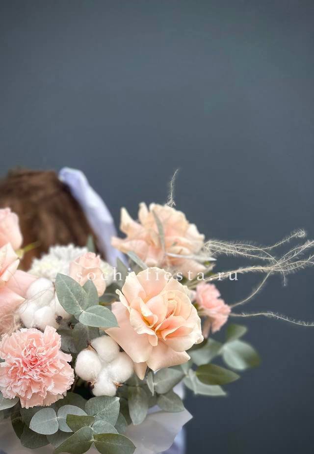 пионовидные кустовые розы, эвкалипт, лимониум, зелень, лента, цилиндр D16.