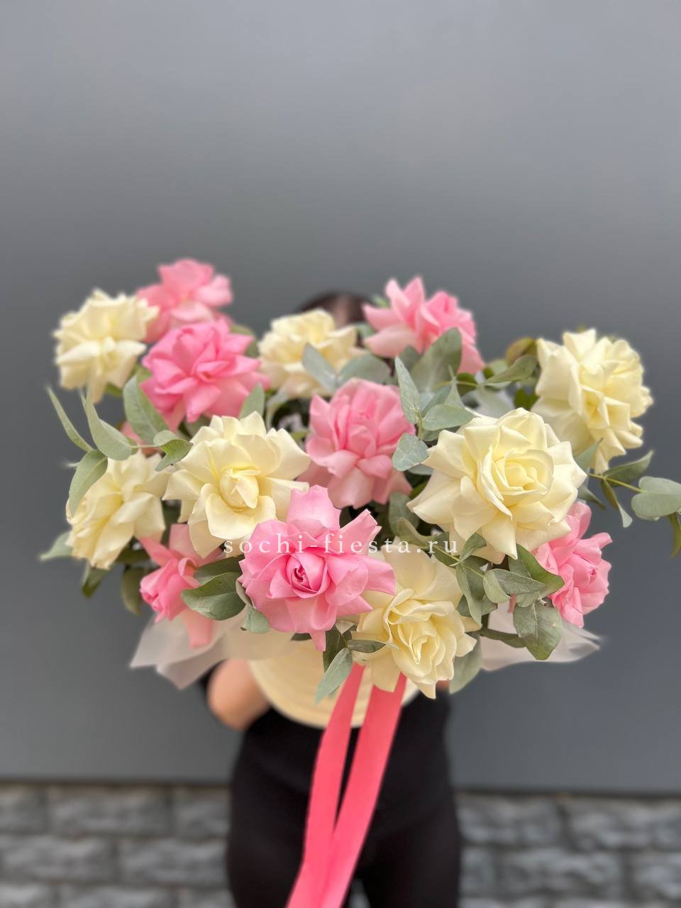 Семнадцать французских роз в пастельном миксе собраны в круглую форму. Композиция компактна и выразительна благодаря сочной зелени эвкалипта.